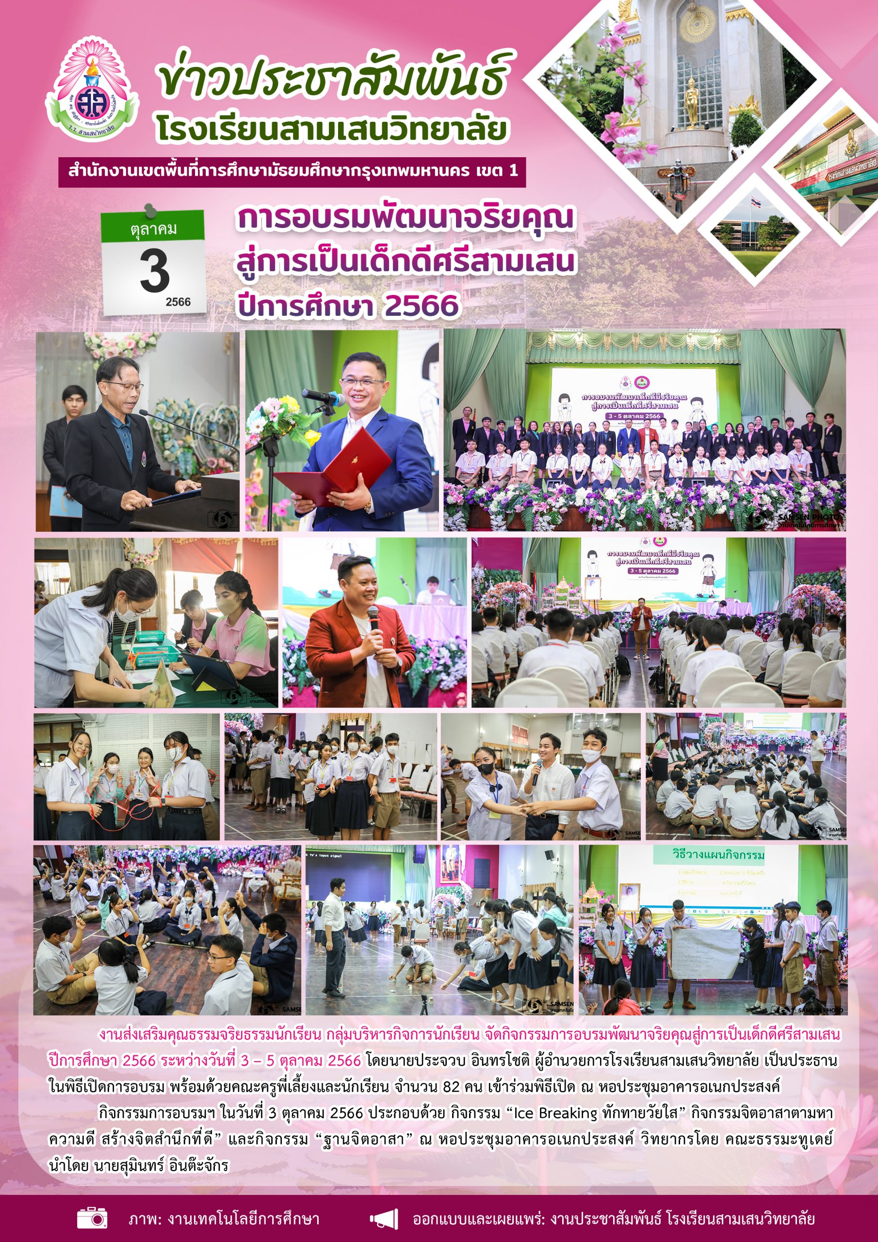 กิจกรรมการอบรมพัฒนาจริยคุณสู่การเป็นเด็กดีศรีสามเสน ปีการศึกษา 2566 ระหว่างวันที่ 3 – 5 ตุลาคม 2566 โดย งานส่งเสริมคุณธรรมจริยธรรมนักเรียน กลุ่มบริหารกิจการนักเรียน