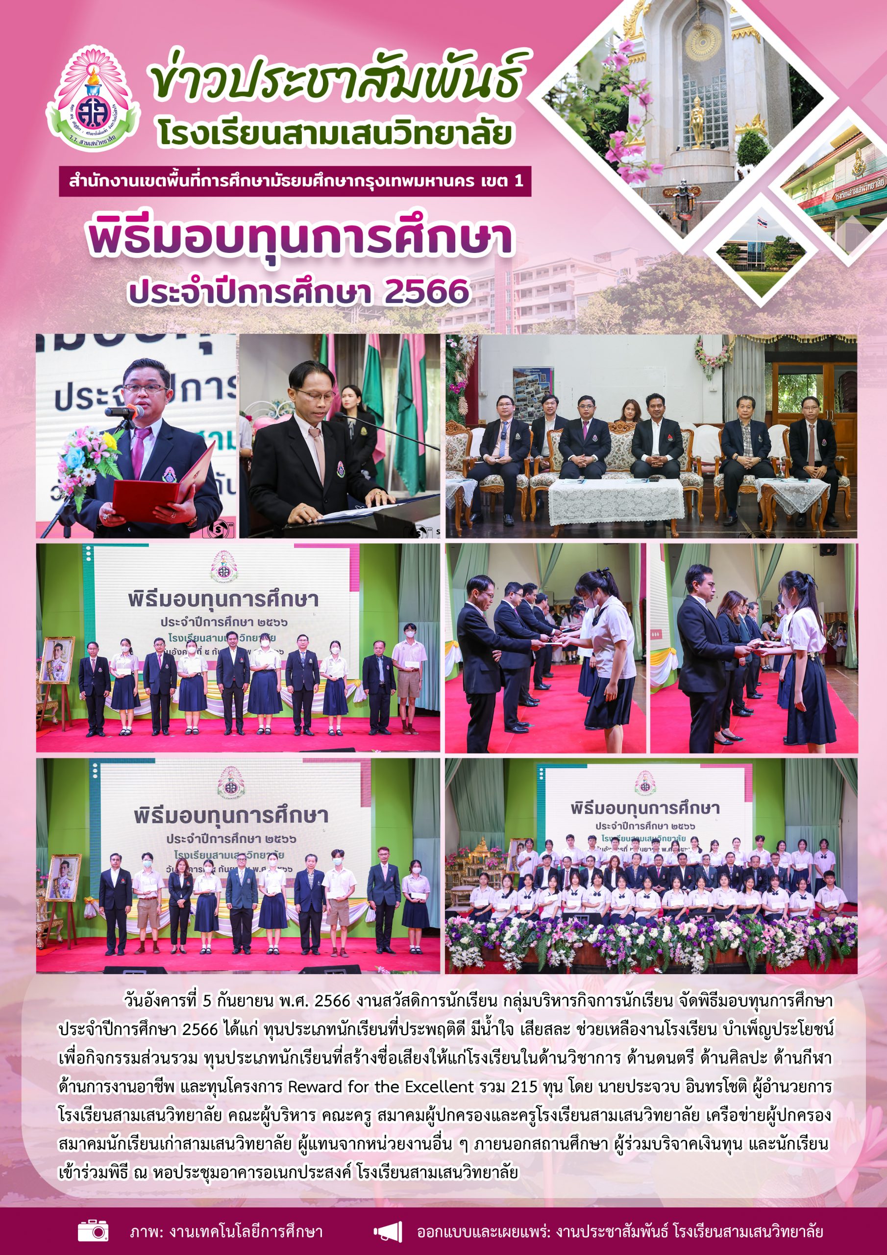 5 กันยายน 2566 พิธีมอบทุนการศึกษา ประจำปีการศึกษา 2566 โดย งานสวัสดิการนักเรียน กลุ่มบริหารกิจการนักเรียน
