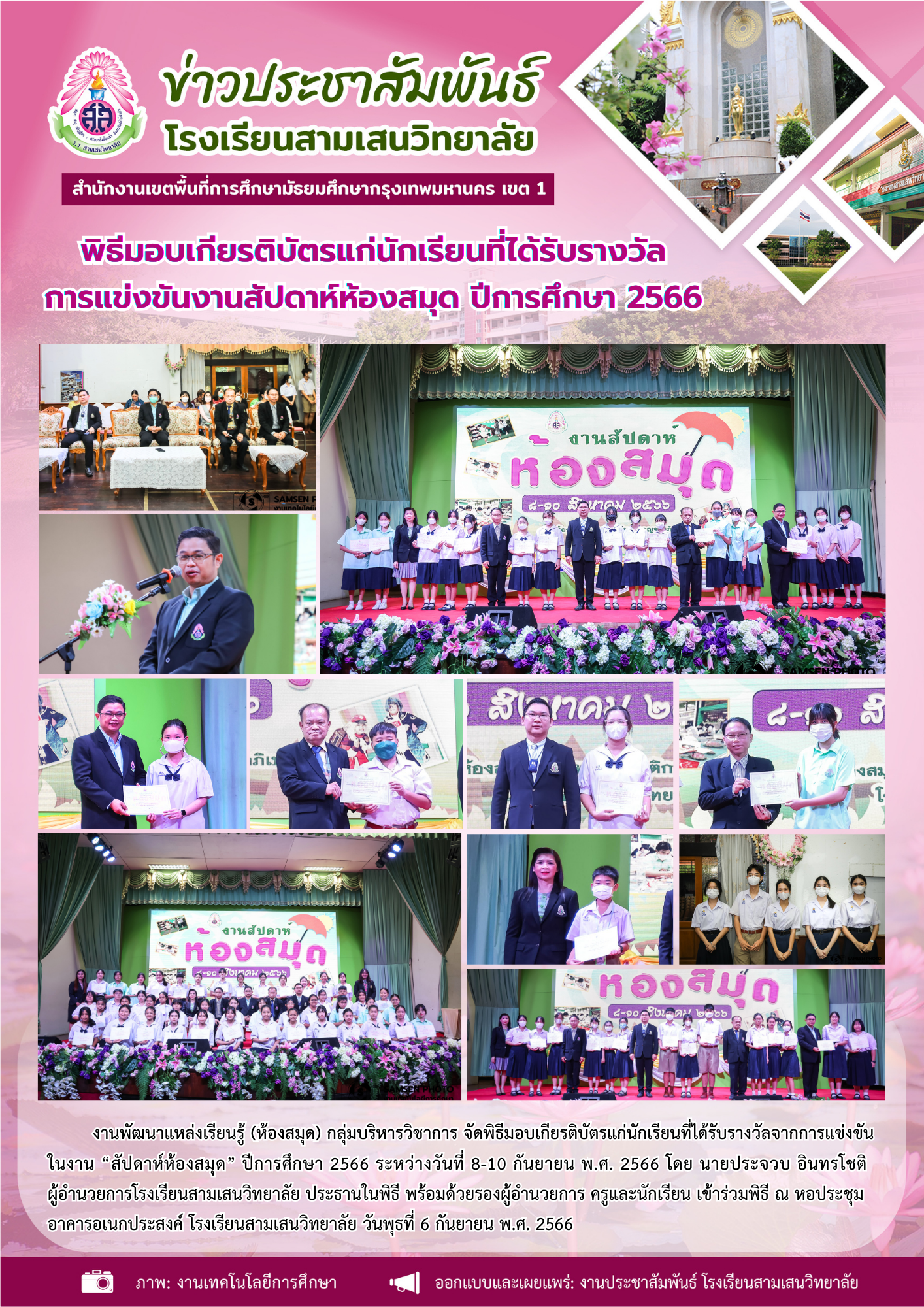6 กันยายน 2566 พิธีมอบเกียรติบัตรแก่นักเรียนที่ได้รับรางวัลจากการแข่งขันในงาน “สัปดาห์ห้องสมุด” ปีการศึกษา 2566 โดย งานพัฒนาแหล่งเรียนรู้ (ห้องสมุด) กลุ่มบริหารวิชาการ