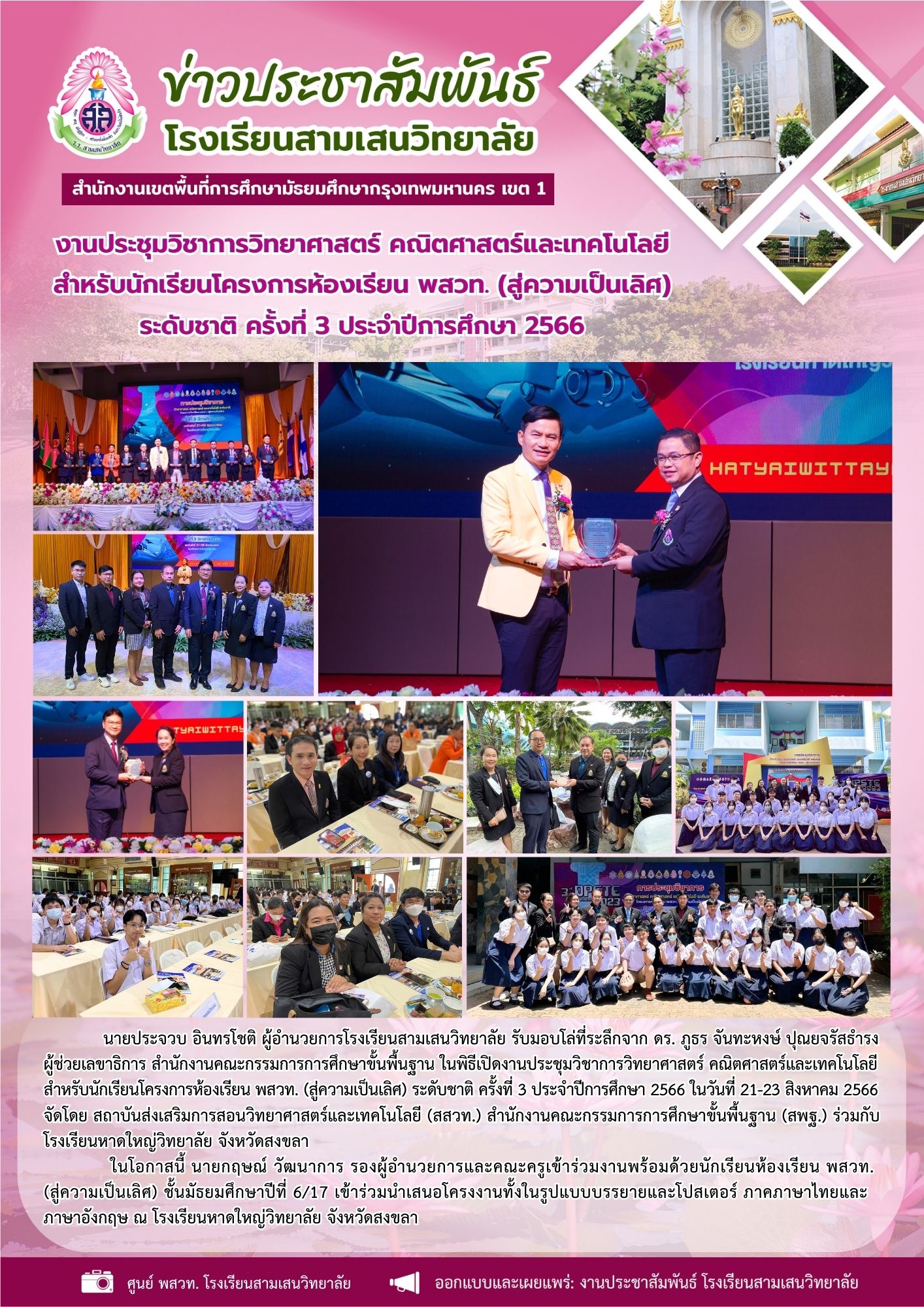 21-23 สิงหาคม 2566 งานประชุมวิชาการวิทยาศาสตร์ คณิตศาสตร์และเทคโนโลยี สำหรับนักเรียนโครงการห้องเรียน พสวท. (สู่ความเป็นเลิศ) ระดับชาติ ครั้งที่ 3 ประจำปีการศึกษา 2566 จัดโดย สถาบันส่งเสริมการสอนวิทยาศาสตร์และเทคโนโลยี (สสวท.) สำนักงานคณะกรรมการการศึกษาขั้นพื้นฐาน (สพฐ.) ร่วมกับโรงเรียนหาดใหญ่วิทยาลัย จังหวัดสงขลา