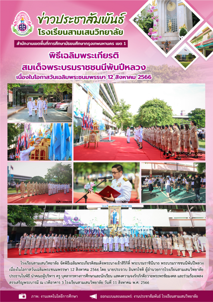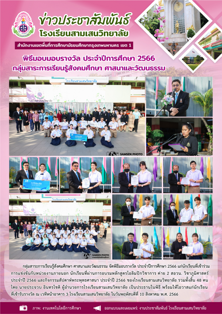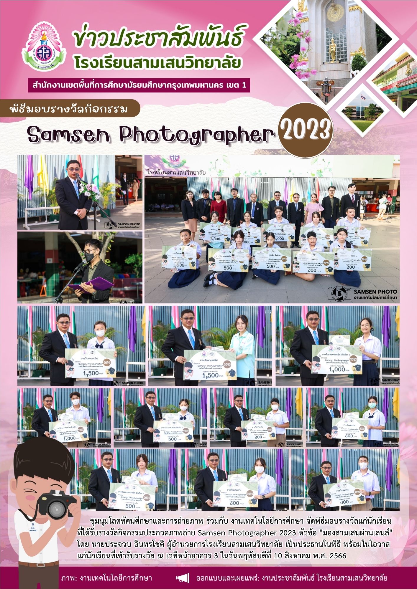 10 สิงหาคม 2566 พิธีมอบรางวัลแก่นักเรียนที่ได้รับรางวัลกิจกรรมประกวดภาพถ่าย Samsen Photographer 2023 หัวข้อ “มองสามเสนผ่านเลนส์” โดย ชุมนุมโสตทัศนศึกษาและการถ่ายภาพ ร่วมกับ งานเทคโนโลยีการศึกษา [ภาพกิจกรรมเพิ่มเติม]