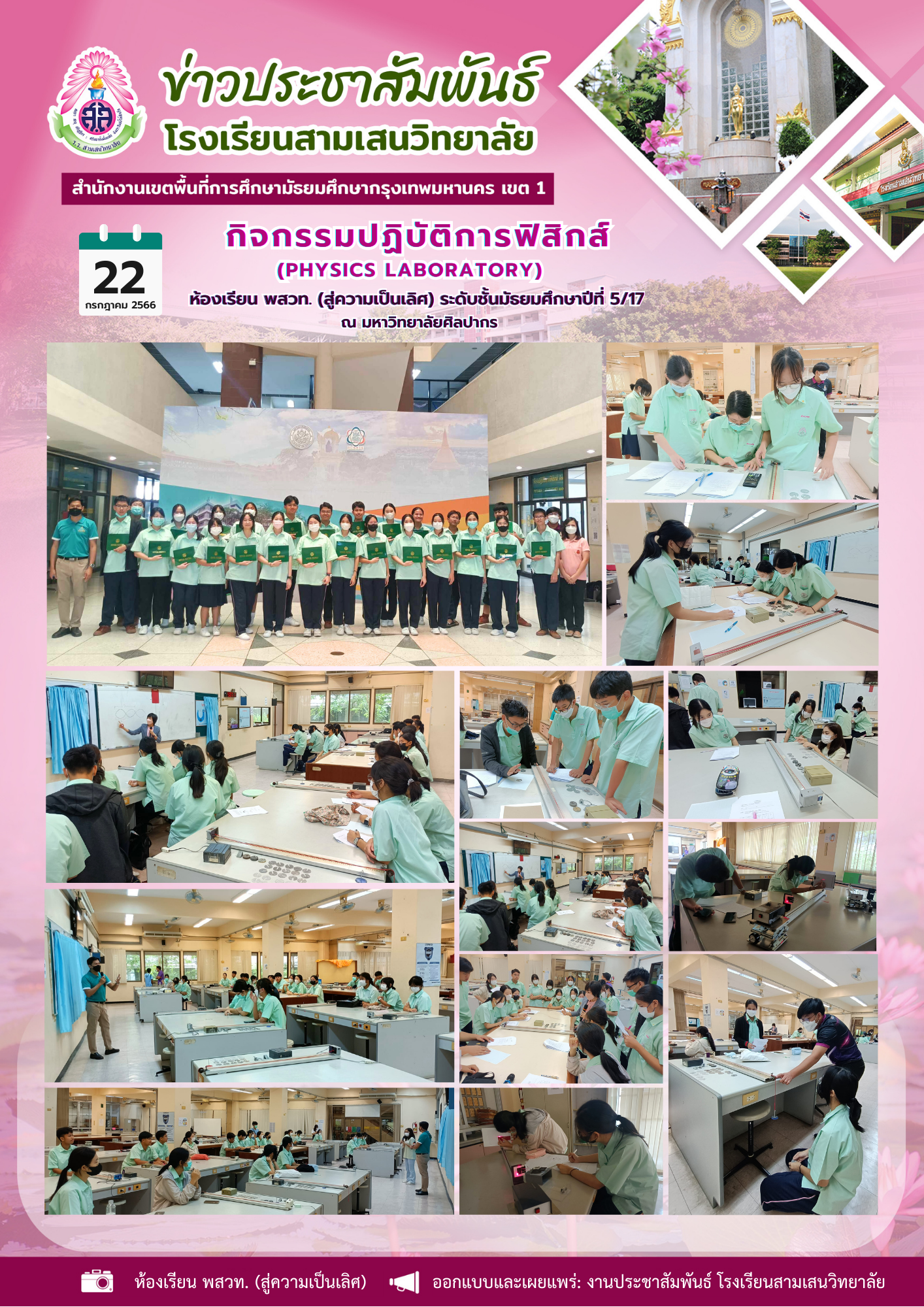 22 กรกฎาคม 2566 กิจกรรมปฏิบัติการฟิสิกส์ (PHYSICS LABORATORY) ห้องเรียน พสวท. (สู่ความเป็นเลิศ) ระดับชั้นมัธยมศึกษาปีที่ 5/17 ณ มหาวิทยาลัยศิลปากร