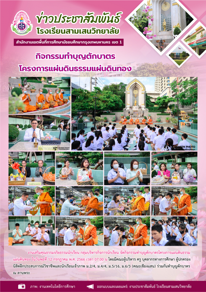 12 กรกฎาคม 2566 กิจกรรมทำบุญตักบาตรโครงการแผ่นดินธรรมแผ่นดินทอง โดย งานส่งเสริมคุณธรรมจริยธรรมนักเรียน กลุ่มบริหารกิจการนักเรียน
