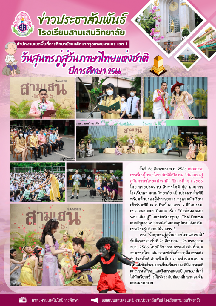 26 มิถุนายน 2566 พิธีเปิดกิจกรรม “วันสุนทรภู่สู่วันภาษาไทยแห่งชาติ” ปีการศึกษา 2566 โดย กลุ่มสาระการเรียนรู้ภาษาไทย