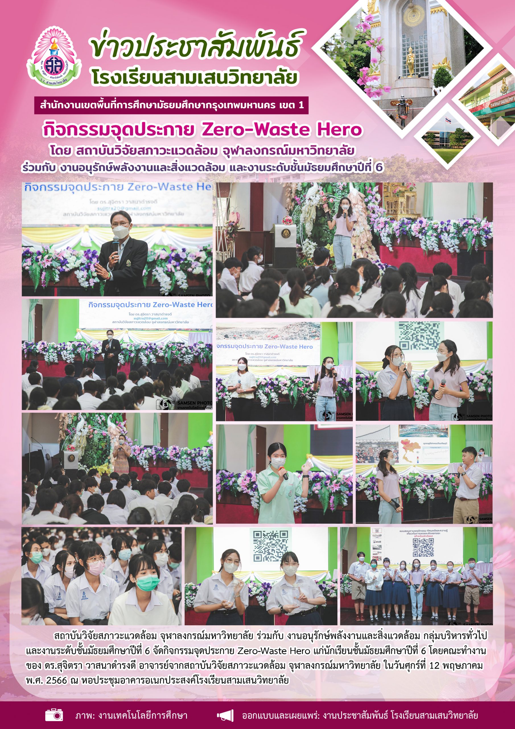 12 พฤษภาคม 2566 กิจกรรมจุดประกาย Zero-Waste Hero ชั้นมัธยมศึกษาปีที่ 6 โดย สถาบันวิจัยสภาวะแวดล้อม จุฬาลงกรณ์มหาวิทยาลัย ร่วมกับ งานอนุรักษ์พลังงานและสิ่งแวดล้อม กลุ่มบริหารทั่วไป และงานระดับชั้นมัธยมศึกษาปีที่ 6