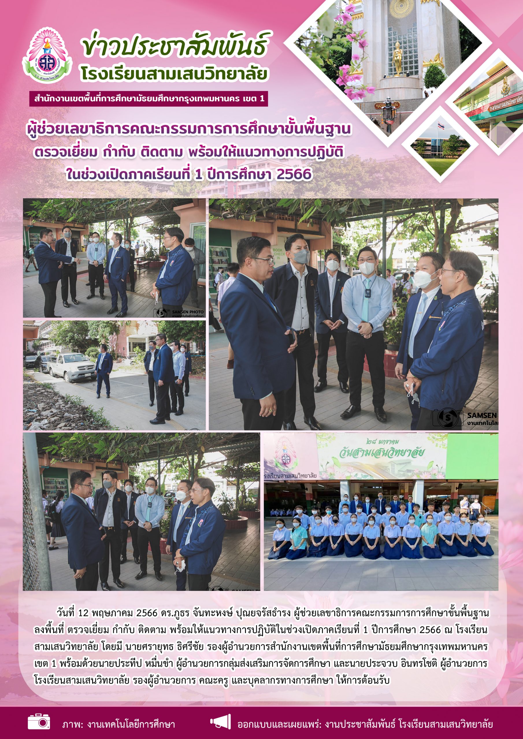 วันที่ 12 พฤษภาคม 2566 ดร.ภูธร จันทะหงษ์ ปุณยจรัสธำรง ผู้ช่วยเลขาธิการคณะกรรมการการศึกษาขั้นพื้นฐาน ลงพื้นที่ ตรวจเยี่ยม กำกับ ติดตาม พร้อมให้แนวทางการปฏิบัติในช่วงเปิดภาคเรียนที่ 1 ปีการศึกษา 2566 ณ โรงเรียนสามเสนวิทยาลัย