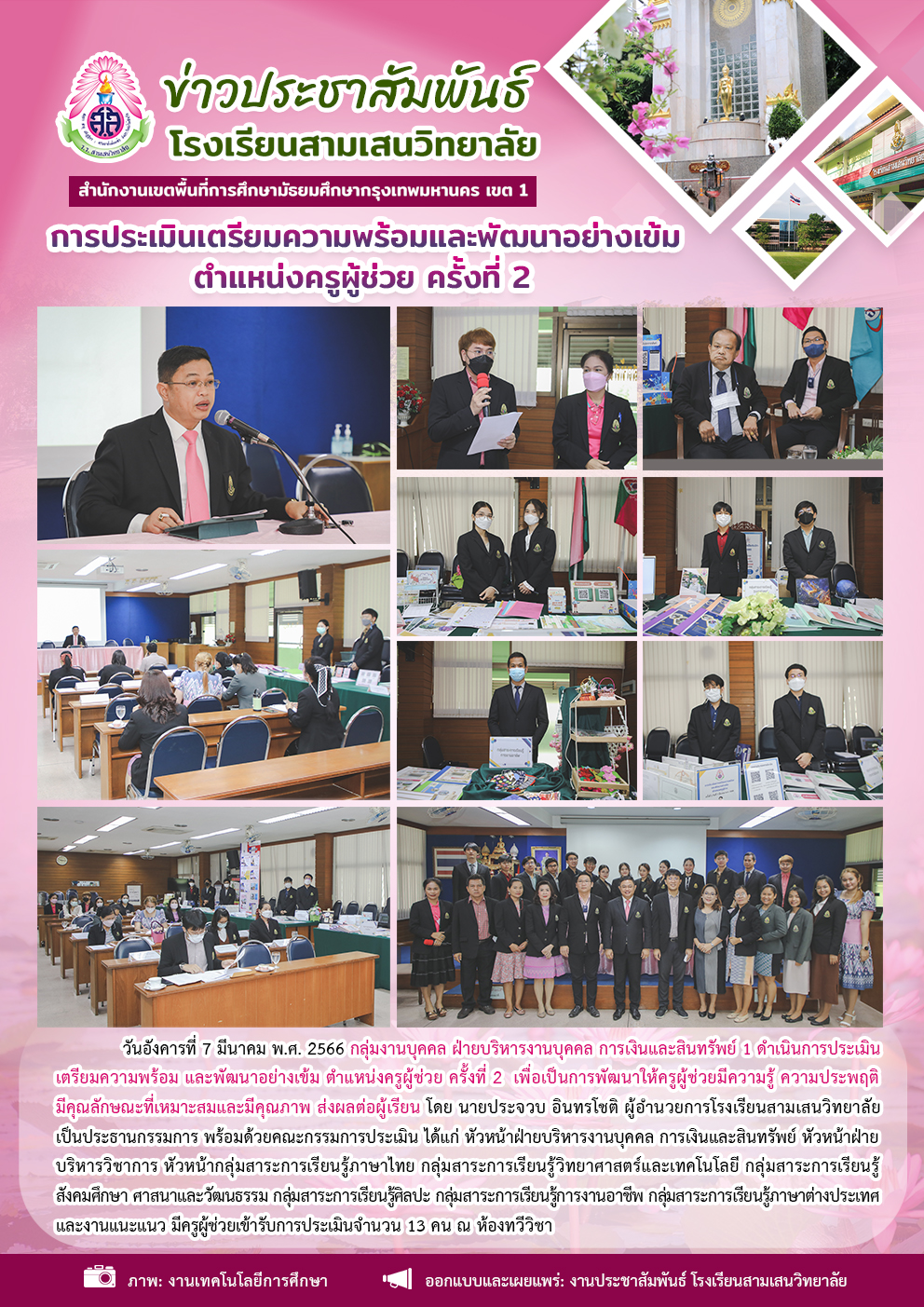 7 มีนาคม 2566 กลุ่มงานบุคคล ฝ่ายบริหารงานบุคคล การเงินและสินทรัพย์ 1 โรงเรียนสามเสนวิทยาลัย ดำเนินการประเมินเตรียมความพร้อมและพัฒนาอย่างเข้ม ตำแหน่งครูผู้ช่วย ครั้งที่ 2