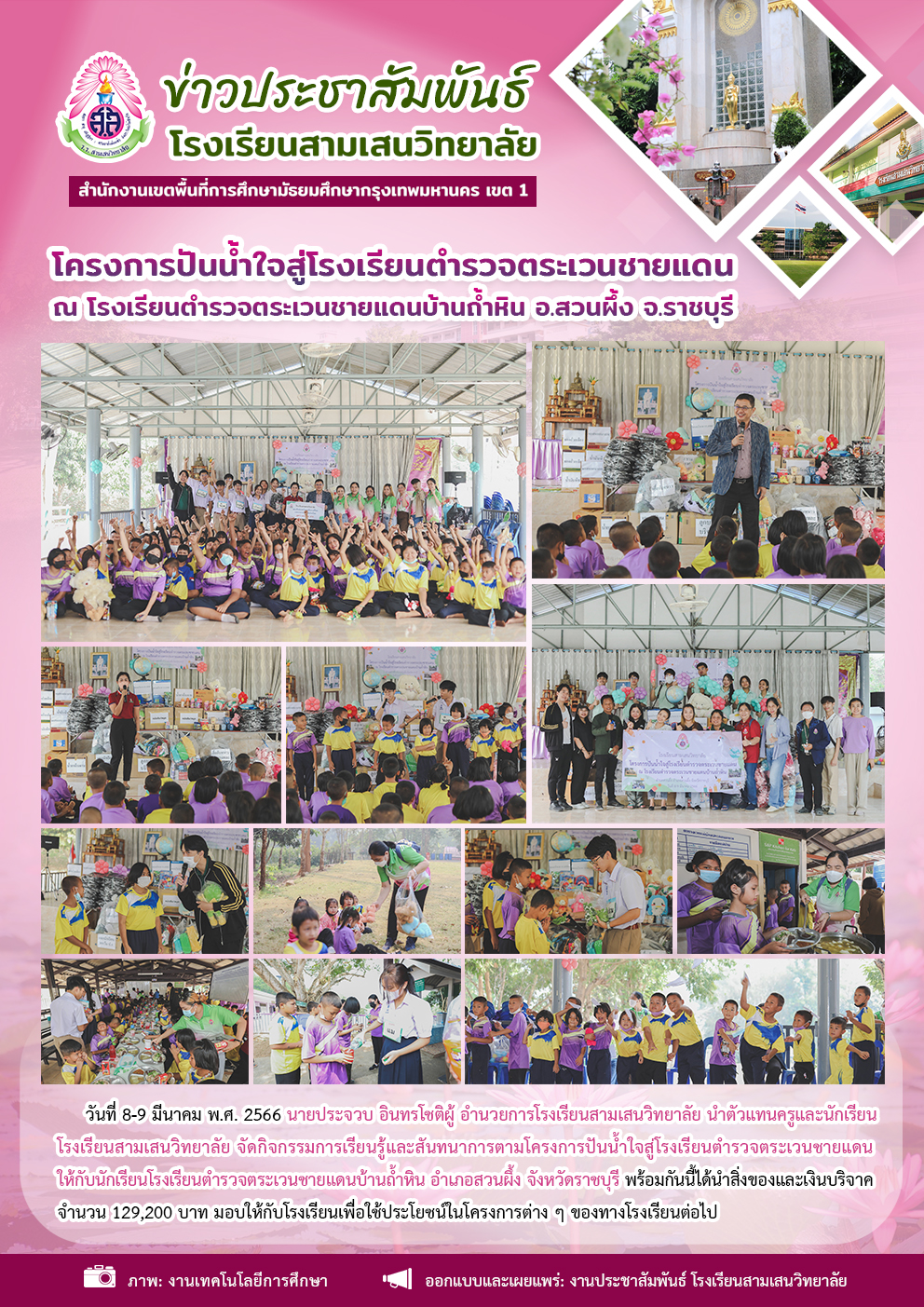 8-9 มีนาคม 2566 โรงเรียนสามเสนวิทยาลัย จัดกิจกรรมการเรียนรู้และสันทนาการตามโครงการปันน้ำใจสู่โรงเรียนตำรวจตระเวนชายแดนบ้านถ้ำหิน อำเภอสวนผึ้ง จังหวัดราชบุรี