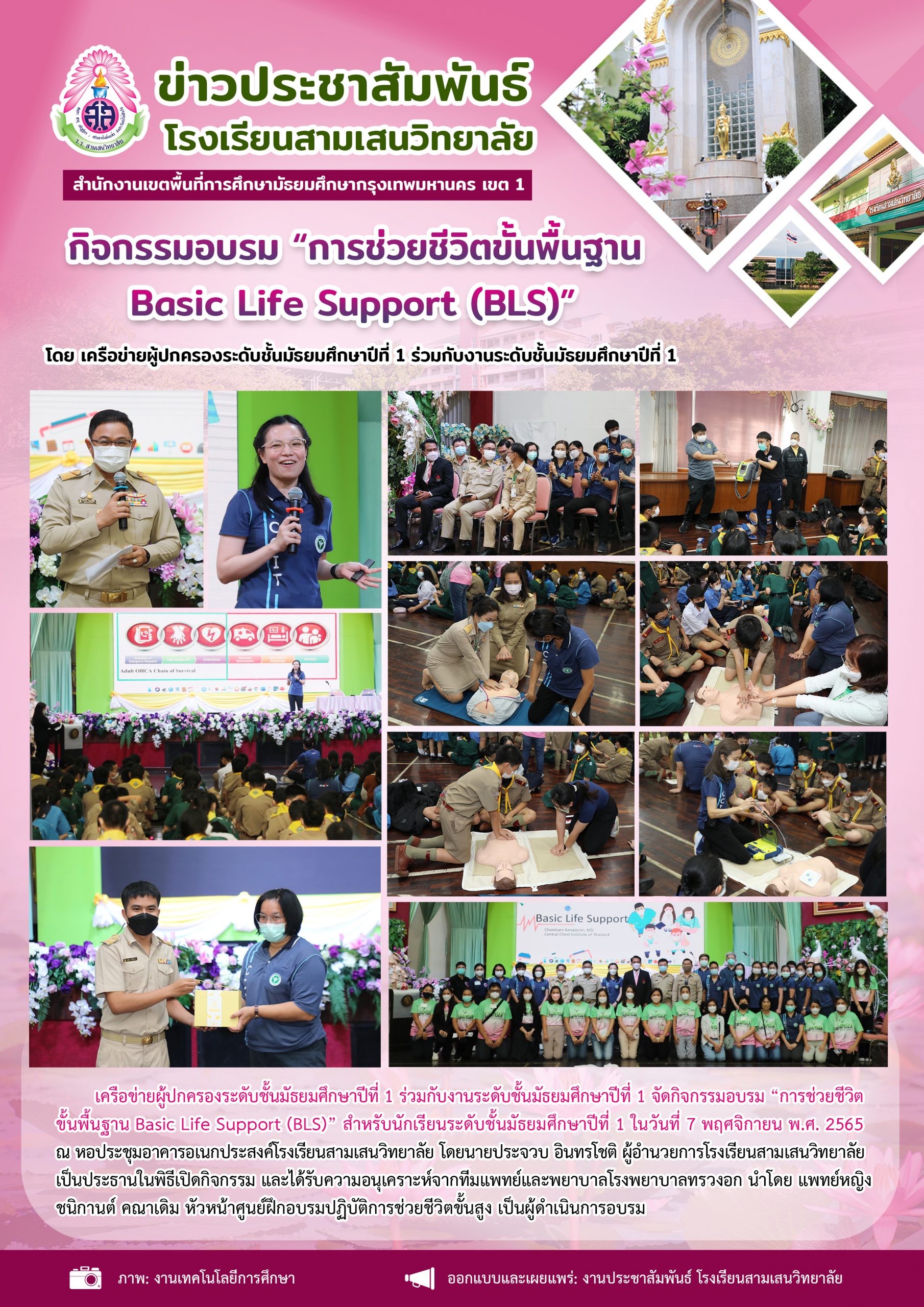 7 พฤศจิกายน 2565 เครือข่ายผู้ปกครองระดับชั้นมัธยมศึกษาปีที่ 1 ร่วมกับงานระดับชั้นมัธยมศึกษาปีที่ 1 จัดกิจกรรม “อบรมการช่วยชีวิตขั้นพื้นฐาน Basic Life Support (BLS)” สำหรับนักเรียนชั้นมัธยมศึกษาปีที่ 1