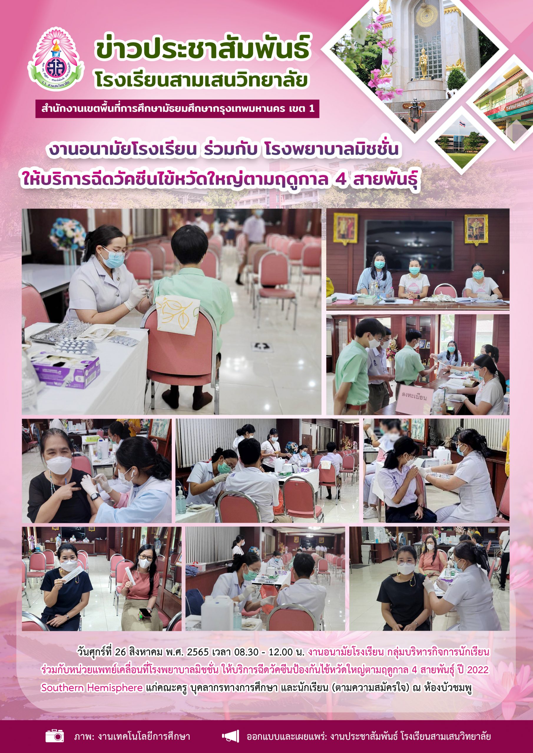 26 สิงหาคม 2565 งานอนามัยโรงเรียน ร่วมกับ โรงพยาบาลมิชชั่น ให้บริการฉีดวัคซีนไข้หวัดใหญ่ตามฤดูกาล 4 สายพันธ์ุ