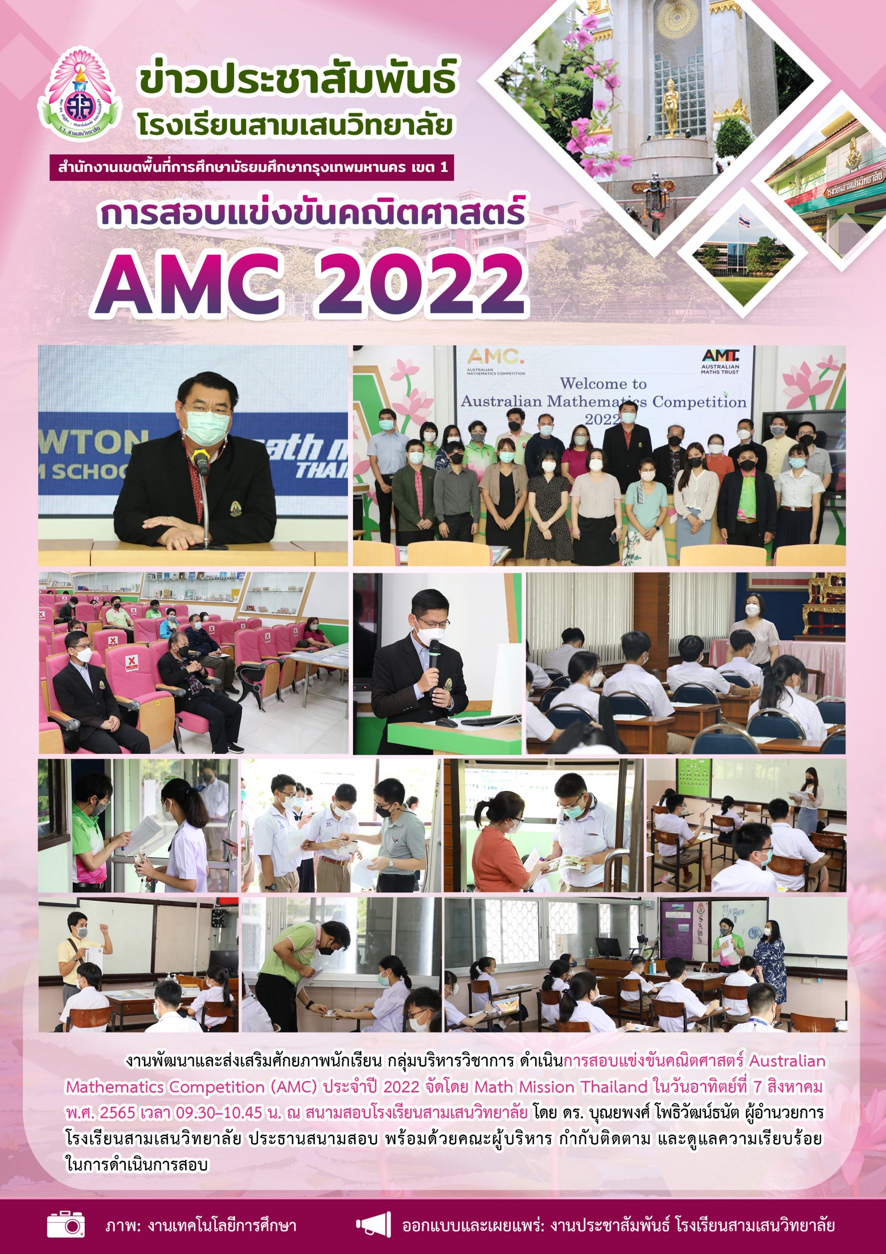 7 สิงหาคม 2565 การดำเนินการสอบแข่งขันคณิตศาสตร์ Australian Mathematics Competition (AMC) ประจำปี 2022 โดย งานพัฒนาและส่งเสริมศักยภาพนักเรียน กลุ่มบริหารวิชาการ โครงการส่งเสริมความเป็นเลิศทางวิชาการ โรงเรียนสามเสนวิทยาลัย