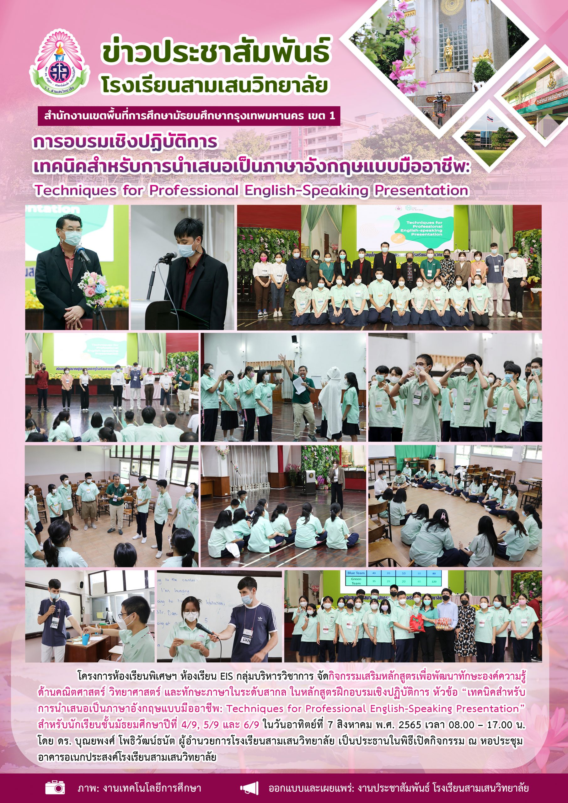 7 สิงหาคม 2565 การฝึกอบรมเชิงปฏิบัติการ หัวข้อ “เทคนิคสำหรับการนำเสนอเป็นภาษาอังกฤษแบบมืออาชีพ: Techniques for Professional English-speaking Presentation” สำหรับนักเรียนชั้นมัธยมศึกษาปีที่ 4/9, 5/9 และ 6/9