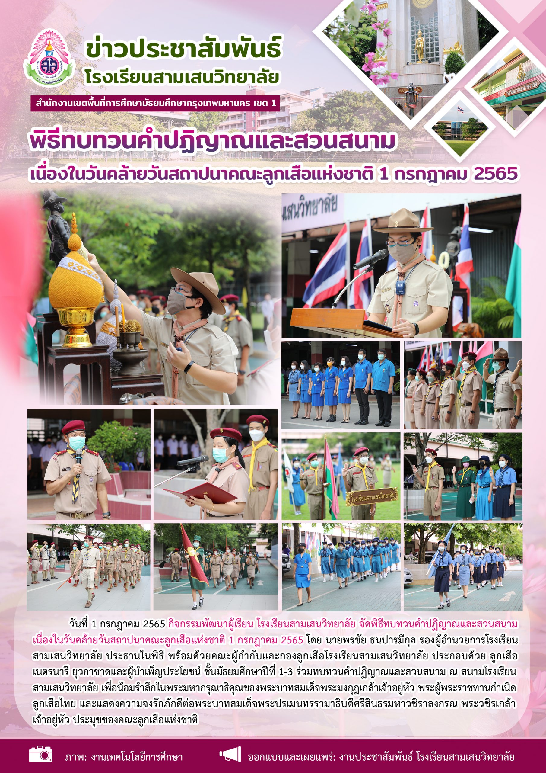 วันที่ 1 กรกฎาคม 2565 กิจกรรมพัฒนาผู้เรียน โรงเรียนสามเสนวิทยาลัย จัดพิธีทบทวนคำปฏิญาณและสวนสนามเนื่องในวันคล้ายวันสถาปนาคณะลูกเสือแห่งชาติ 1 กรกฎาคม 2565