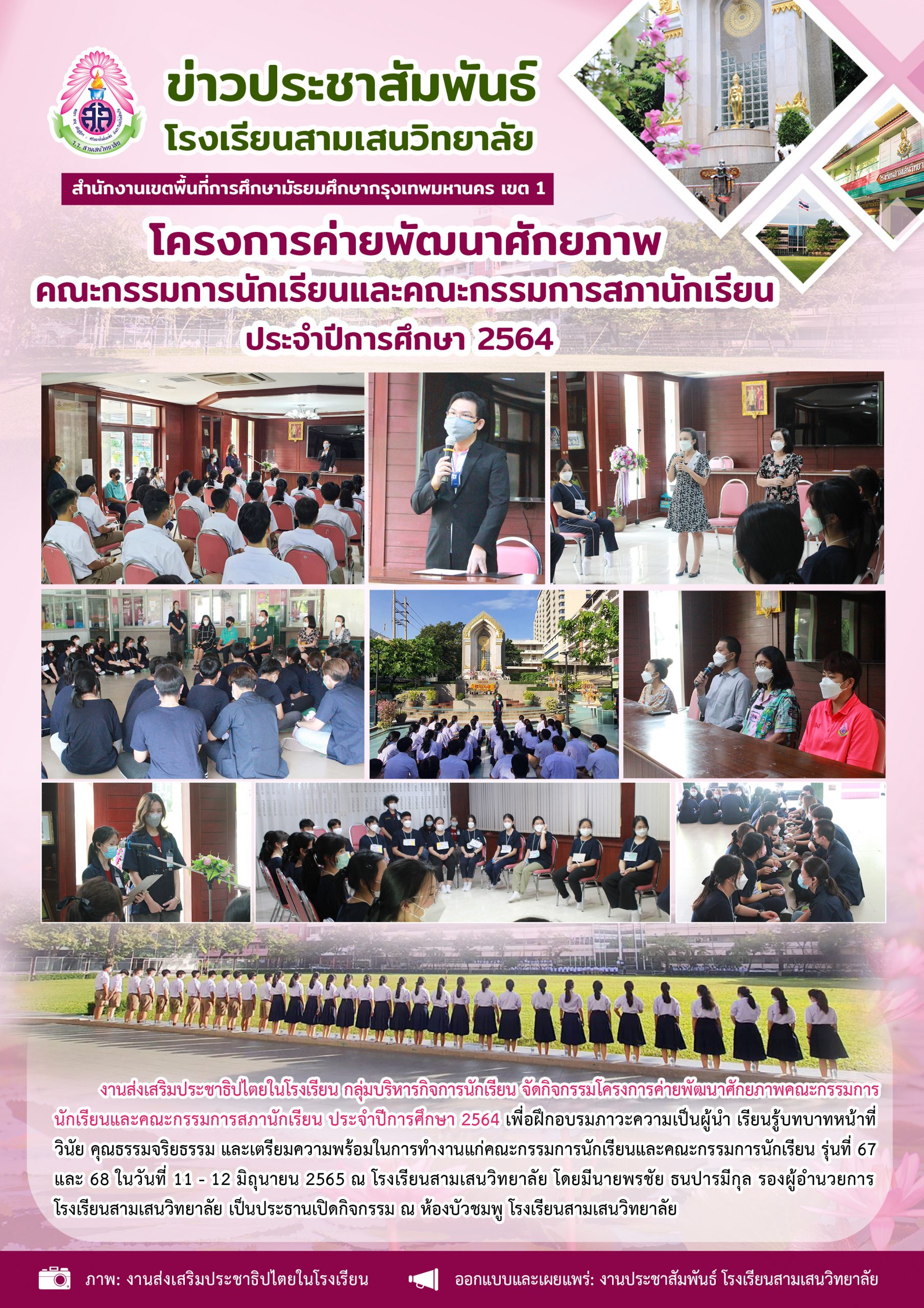 11-12 มิถุนายน 2565 งานส่งเสริมประชาธิปไตยในโรงเรียน กลุ่มบริหารกิจการนักเรียน จัดกิจกรรมโครงการค่ายพัฒนาศักยภาพคณะกรรมการ นักเรียนและคณะกรรมการสภานักเรียน ประจำปีการศึกษา 2564