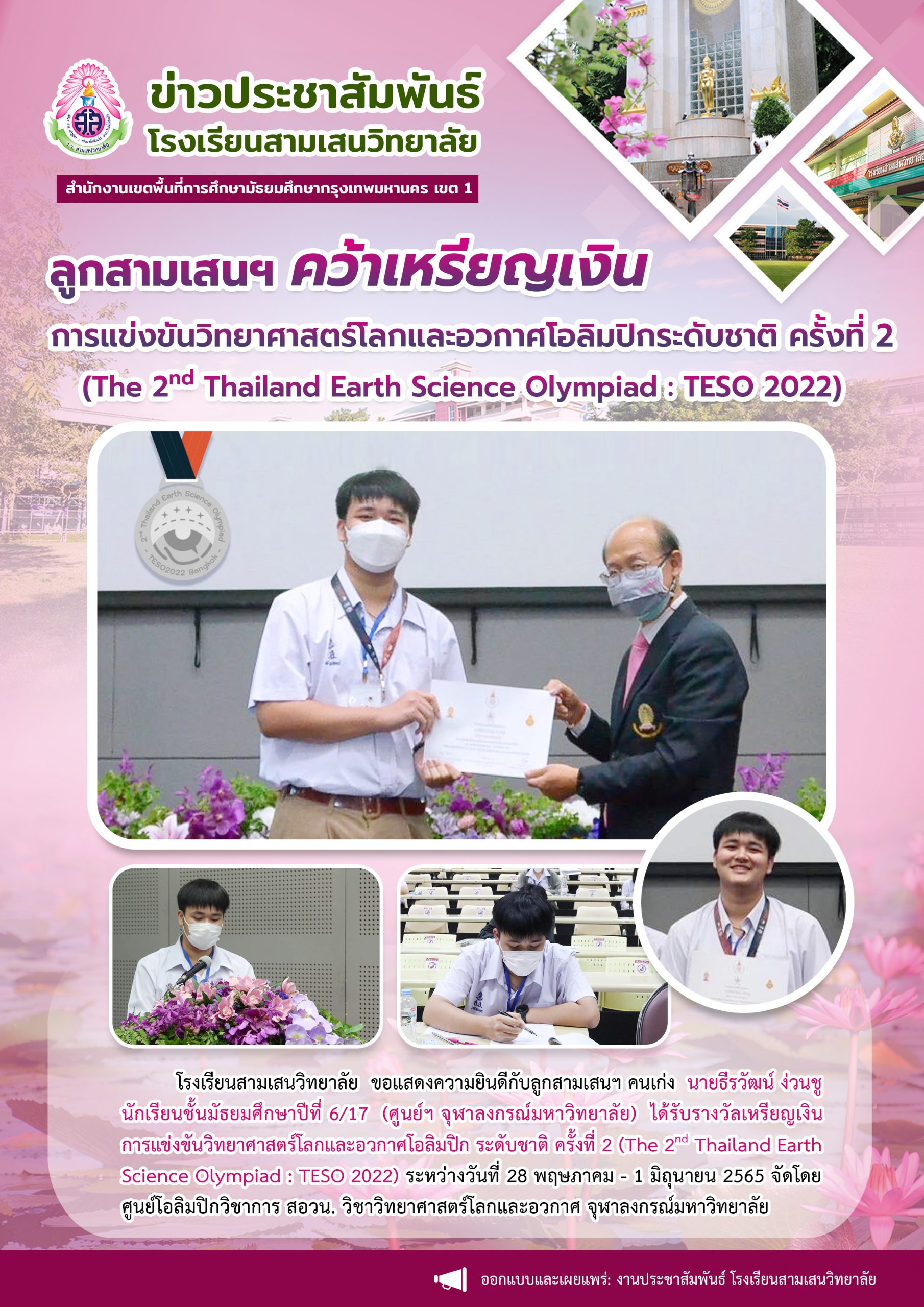 🎉ขอแสดงความยินดีกับลูกสามเสนฯ คนเก่ง🥳🎊 นายธีรวัฒน์ ง่วนชู นักเรียนชั้นมัธยมศึกษาปีที่ 6/17 (ศูนย์ฯ จุฬาลงกรณ์มหาวิทยาลัย) ได้รับรางวัลเหรียญเงิน การแข่งขันวิทยาศาสตร์โลกและอวกาศโอลิมปิก ระดับชาติ ครั้งที่ 2 (The 2nd Thailand Earth Science Olympiad : TESO 2022)