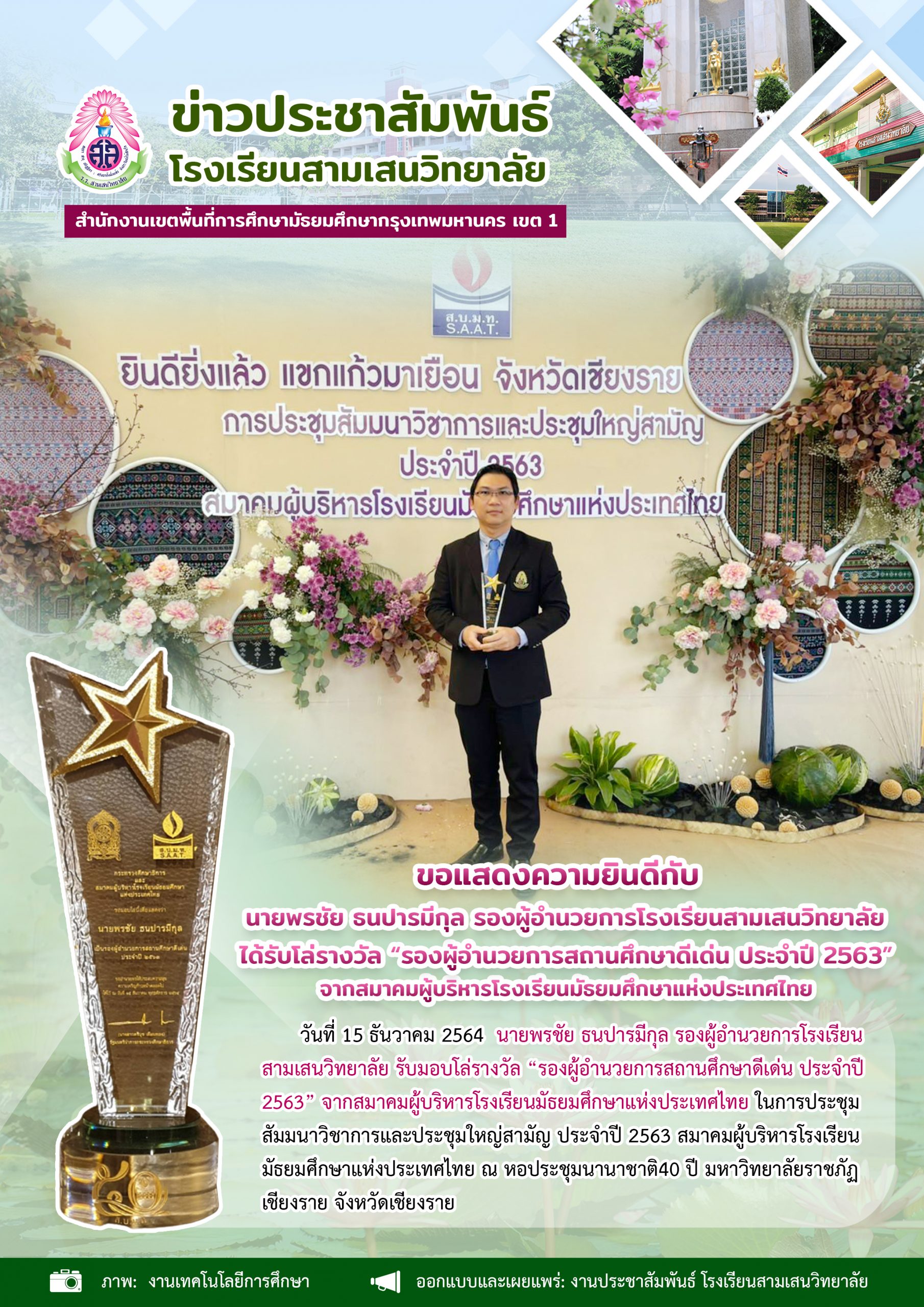 โรงเรียนสามเสนวิทยาลัย ขอแสดงความยินดีกับ นายพรชัย ธนปารมีกุล รองผู้อำนวยการโรงเรียนสามเสนวิทยาลัย ในโอกาสได้รับโล่รางวัล “รองผู้อำนวยการสถานศึกษาดีเด่น ประจำปี 2563” จากสมาคมผู้บริหารโรงเรียนมัธยมศึกษาแห่งประเทศไทย