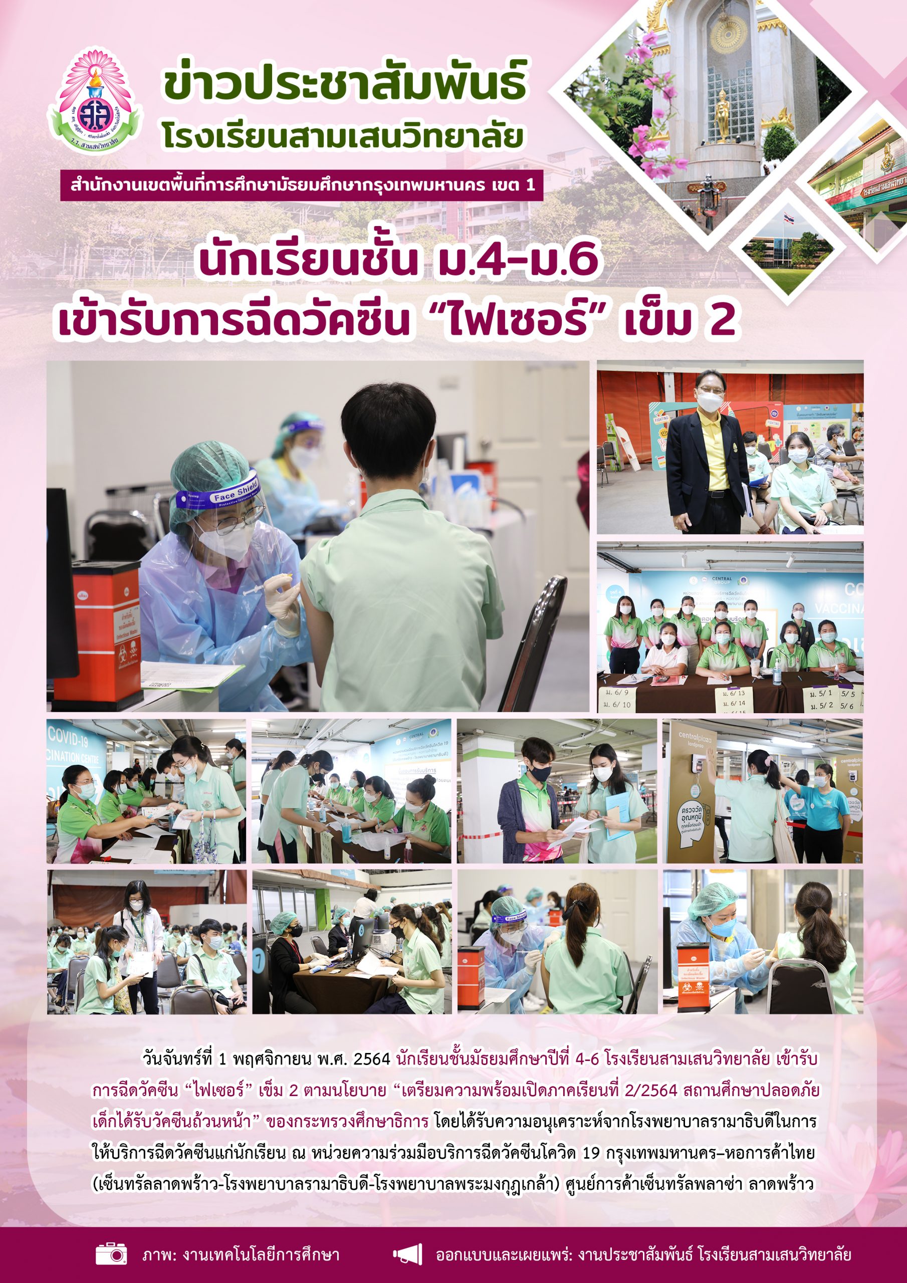 1 พฤศจิกายน 2564 นักเรียนชั้น ม.4-6 เข้ารับการฉีดวัคซีน “ไฟเซอร์” เข็ม 2