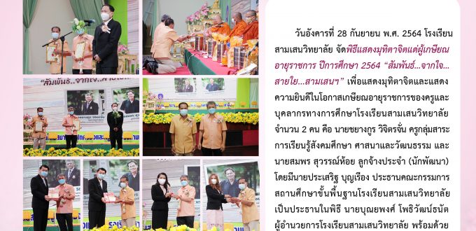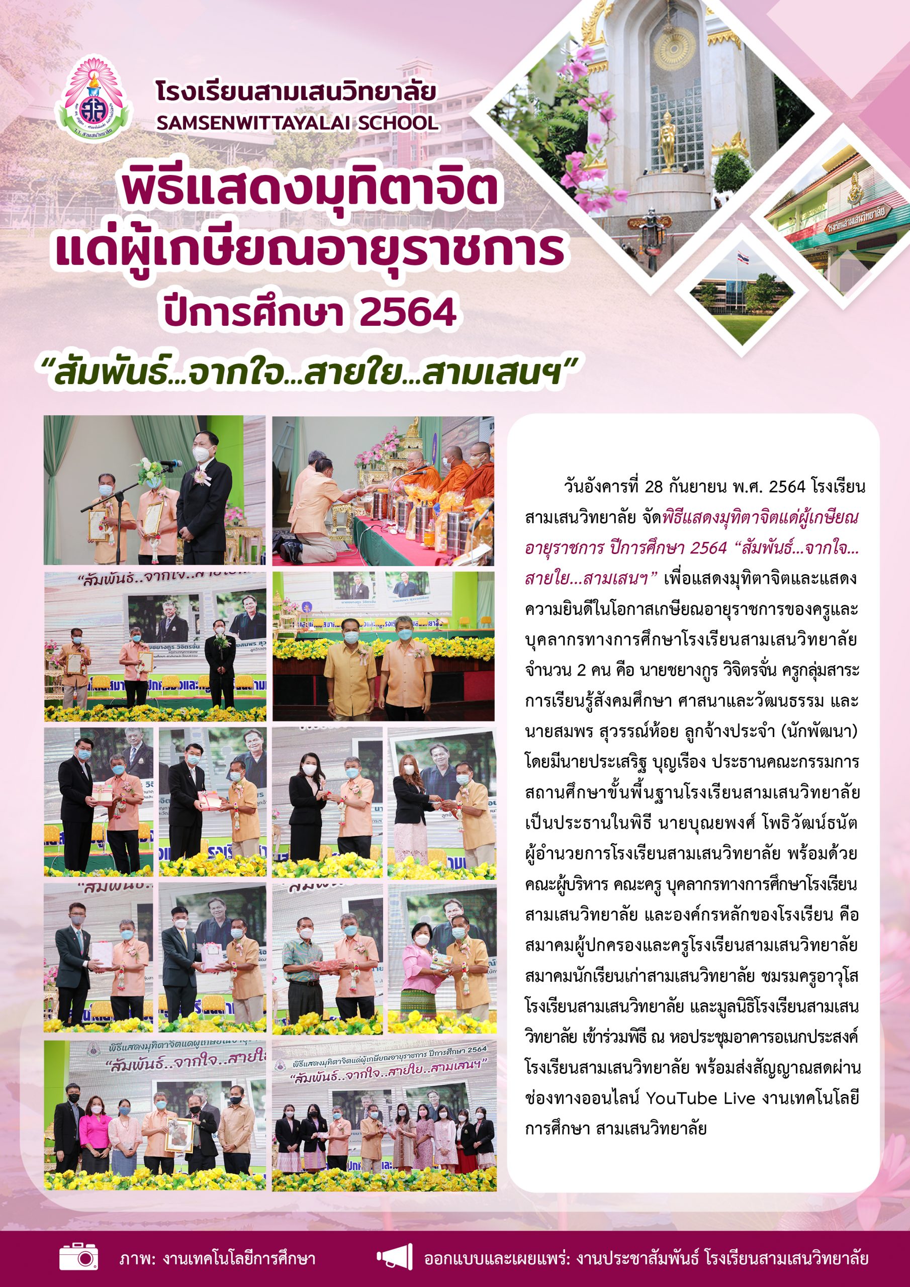 วันที่ 28 กันยายน 2564 พิธีแสดงมุทิตาจิตแด่ผู้เกษียณอายุราชการ ปีการศึกษา 2564 “สัมพันธ์…จากใจ…สายใย…สามเสนฯ”