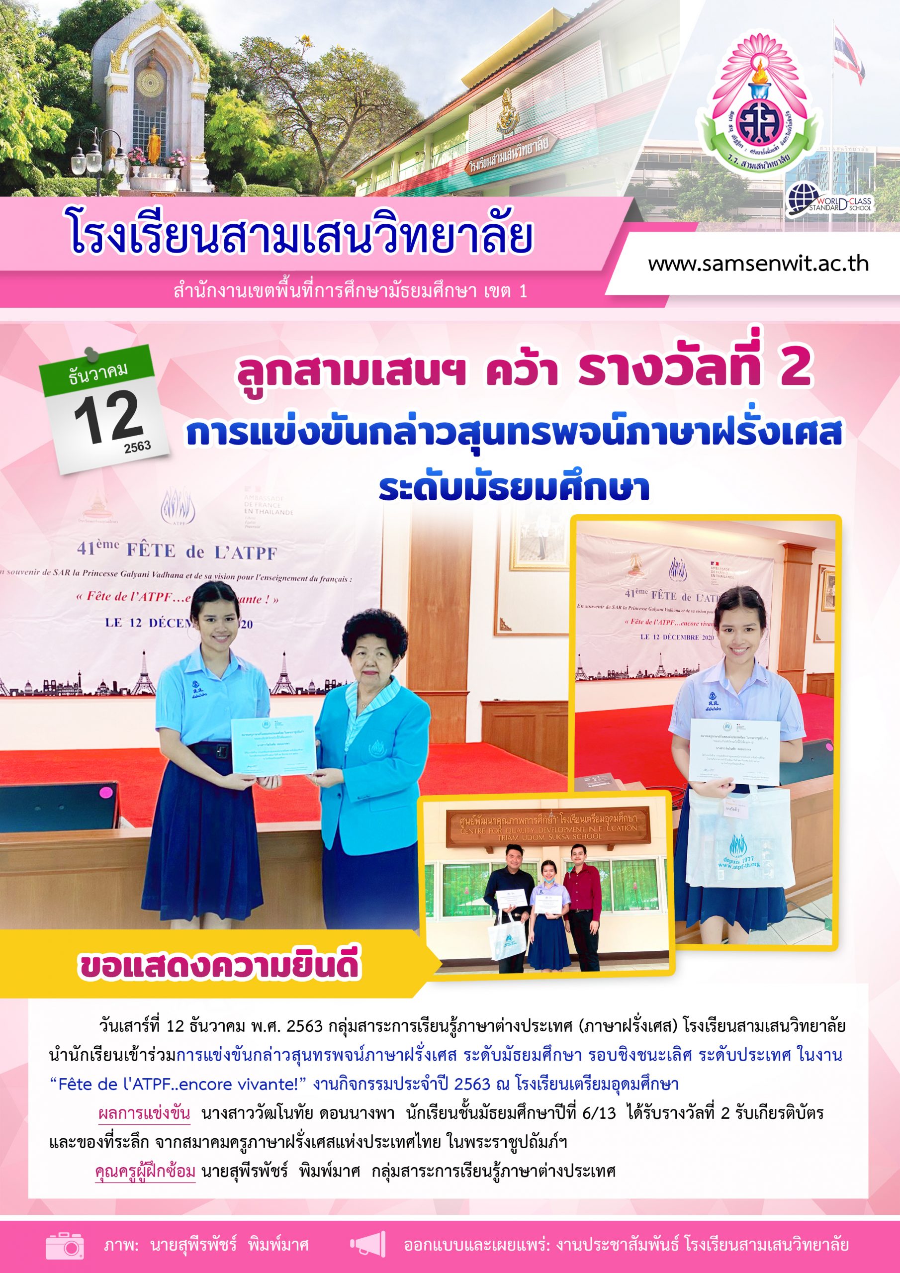 ลูกสามเสนฯ คว้า รางวัลที่ 2 การแข่งขันกล่าวสุนทรพจน์ภาษาฝรั่งเศส ระดับมัธยมศึกษา