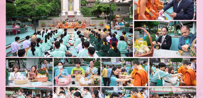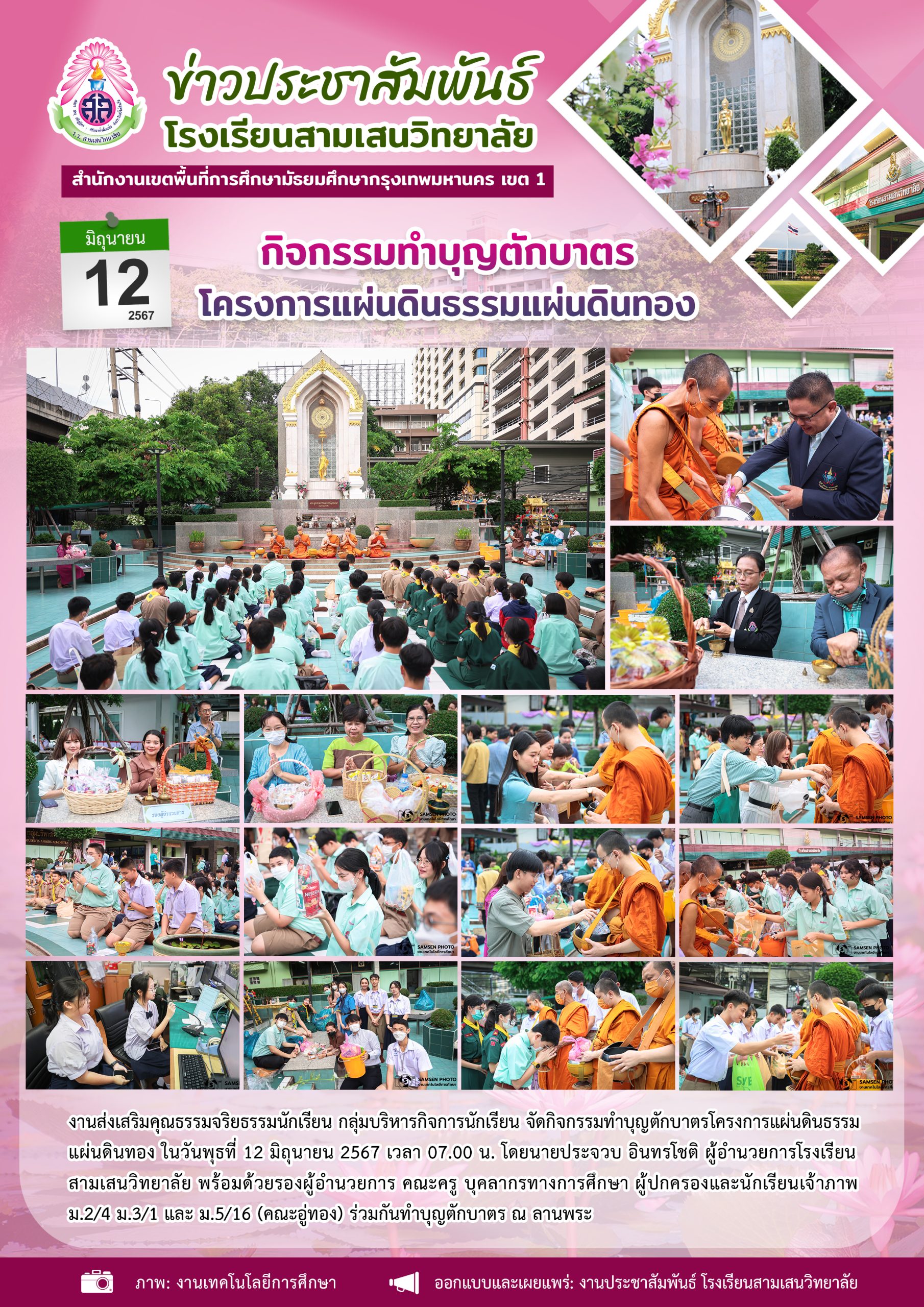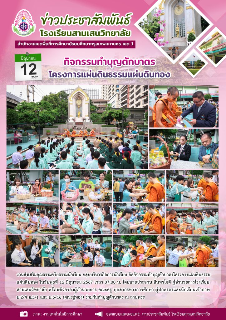 12 มิถุนายน 2567 กิจกรรมทำบุญตักบาตรเโครงการแผ่นดินธรรมแผ่นดินทอง โดย งานเสริมคุณธรรมจริยธรรมนักเรียน กลุ่มบริหารกิจการนักเรียน