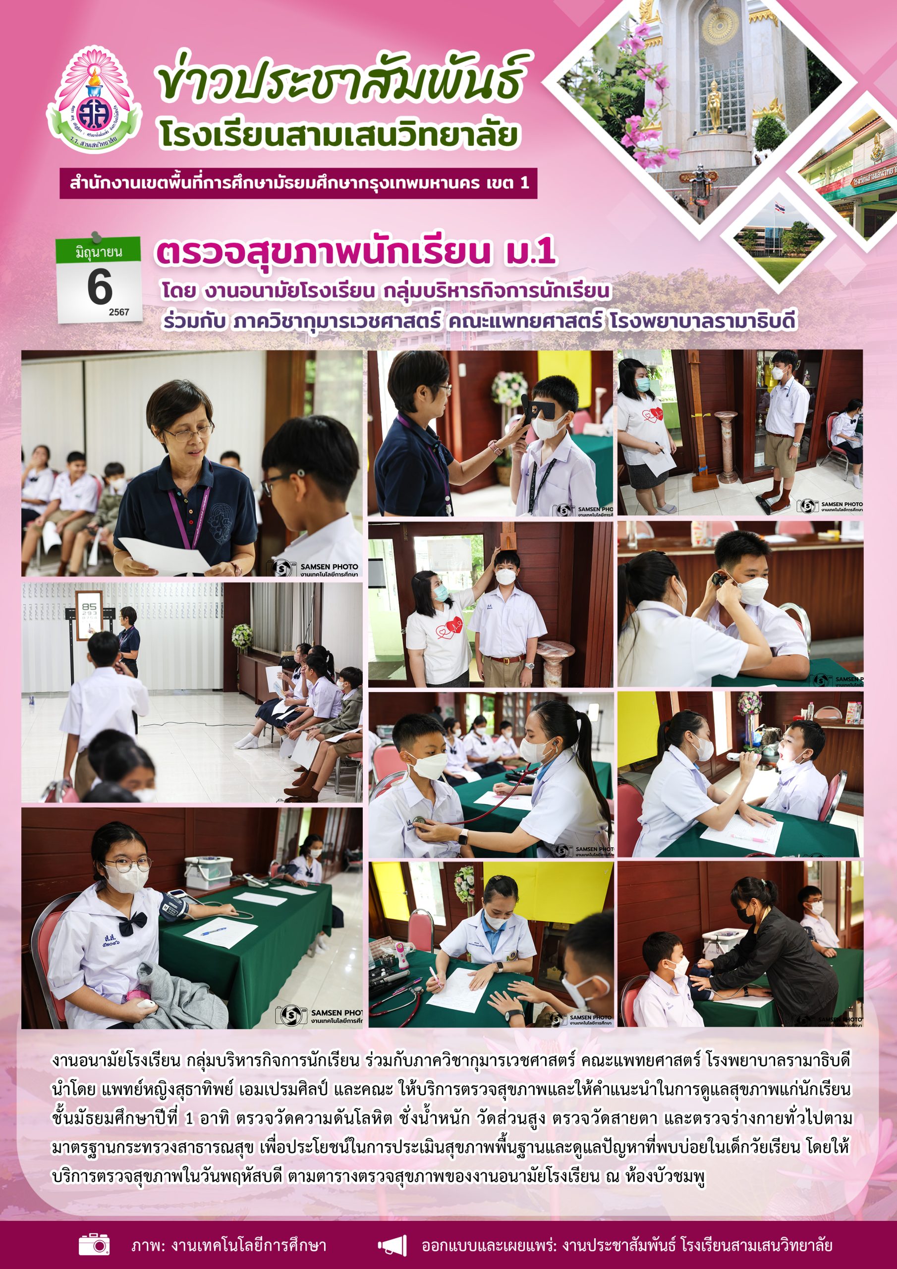 6 มิถุนายน 2567 ตรวจสุขภาพนักเรียน ระดับชั้นมัธยมศึกษาปีที่ 1 โดย งานอนามัยโรงเรียน กลุ่มบริหารกิจการนักเรียน ร่วมกับ ภาควิชากุมารเวชศาสตร์ คณะแพทยศาสตร์ โรงพยาบาลรามาธิบดี