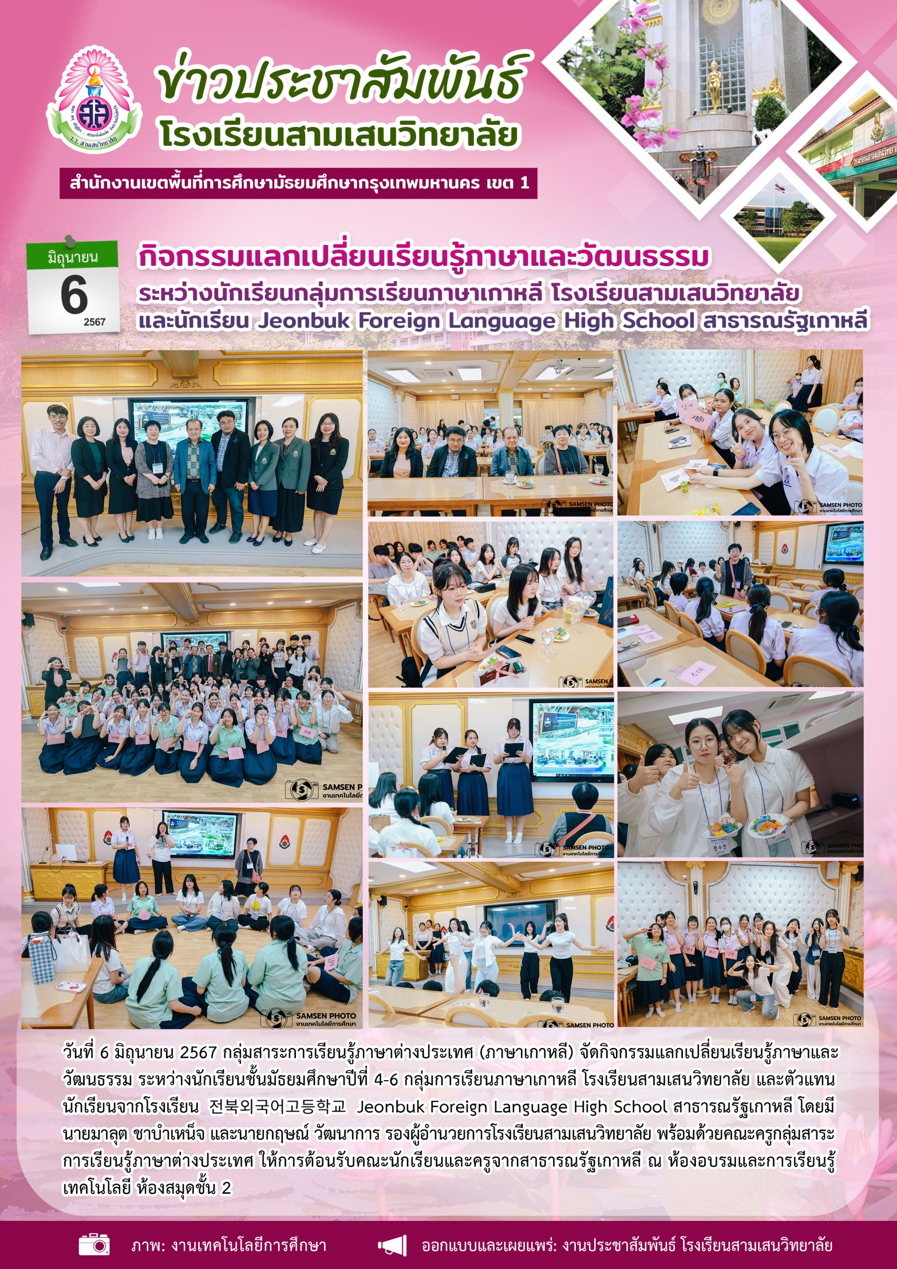 6 มิถุนายน 2567 กิจกรรมแลกเปลี่ยนเรียนรู้ภาษาและวัฒนธรรม ระหว่างนักเรียนกลุ่มการเรียนภาษาเกาหลี โรงเรียนสามเสนวิทยาลัย และนักเรียน 전북외국어고등학교 Jeonbuk Foreign Language High School สาธารณรัฐเกาหลี