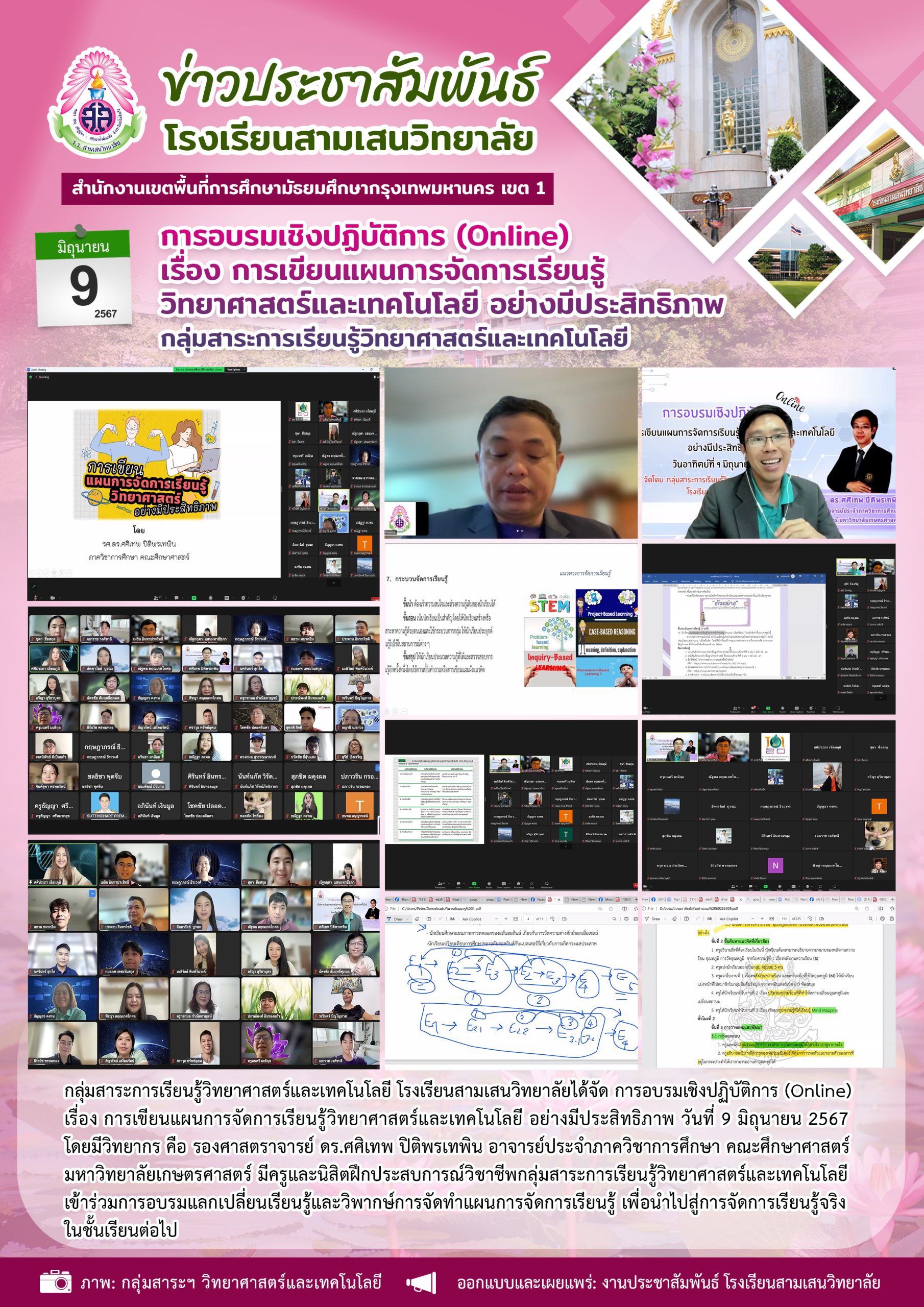 9 มิถุนายน 2567 การอบรมเชิงปฏิบัติการ (Online) เรื่อง การเขียนแผนการจัดการเรียนรู้ วิทยาศาสตร์และเทคโนโลยี อย่างมีประสิทธิภาพ กลุ่มสาระการเรียนรู้วิทยาศาสตร์และเทคโนโลยี