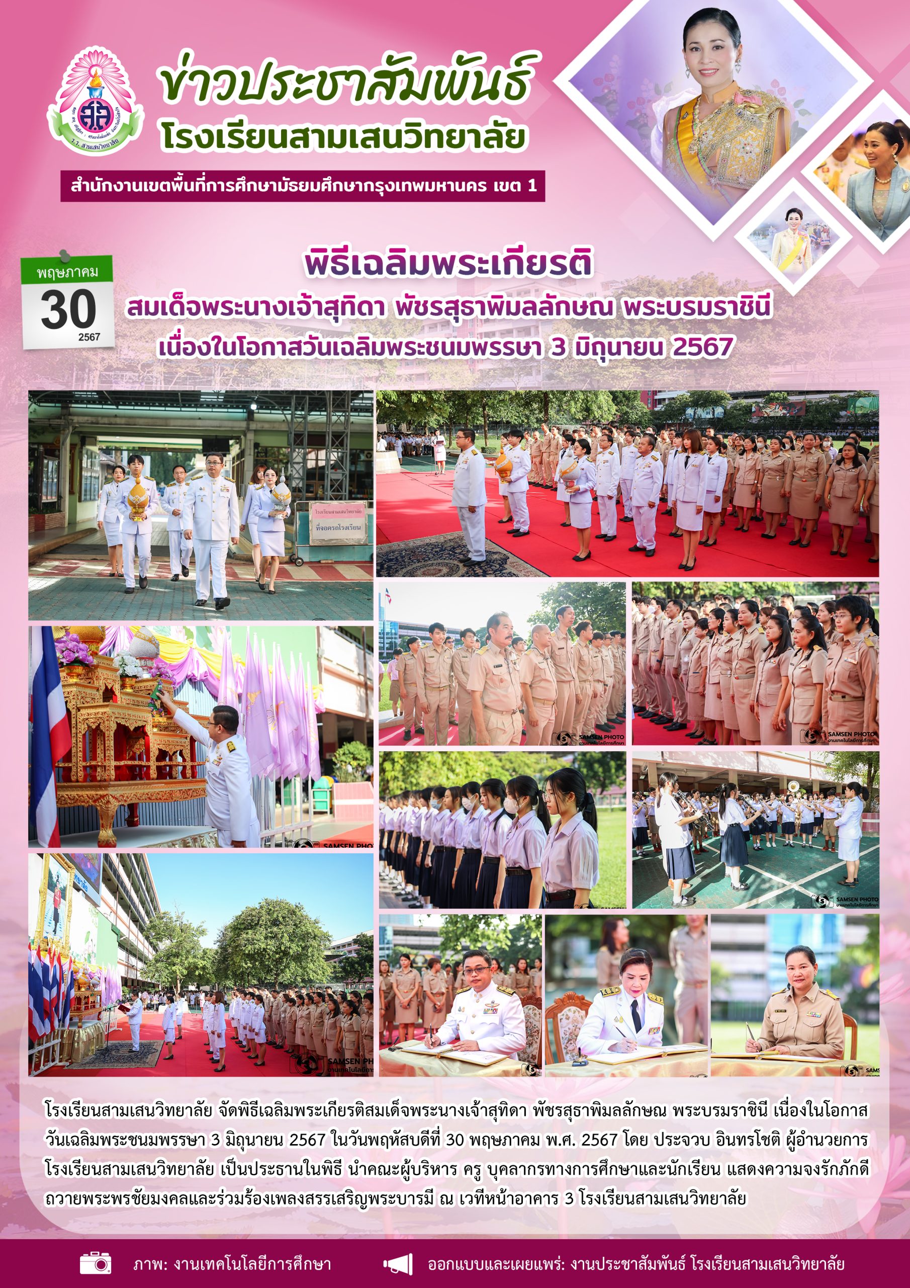 30 พฤษภาคม 2567 พิธีเฉลิมพระเกียรติสมเด็จพระนางเจ้าสุทิดา พัชรสุธาพิมลลักษณ พระบรมราชินี เนื่องในโอกาสวันเฉลิมพระชนมพรรษา 3 มิถุนายน 2567