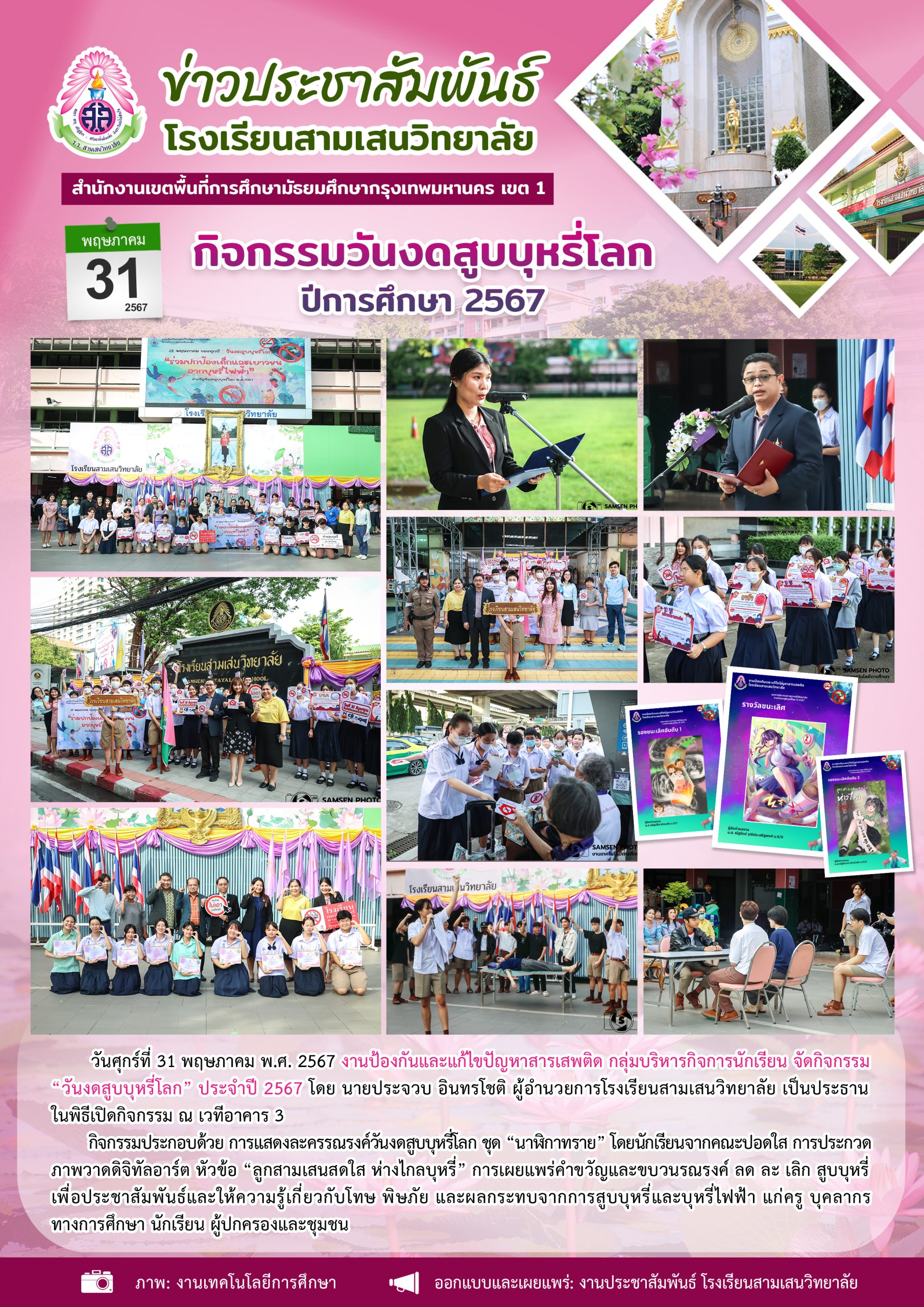 31 พฤษภาคม 2567 กิจกรรม “วันงดสูบบุหรี่โลก” ประจำปี 2567 โดย งานป้องกันและแก้ไขปัญหาสารเสพติด กลุ่มบริหารกิจการนักเรียน