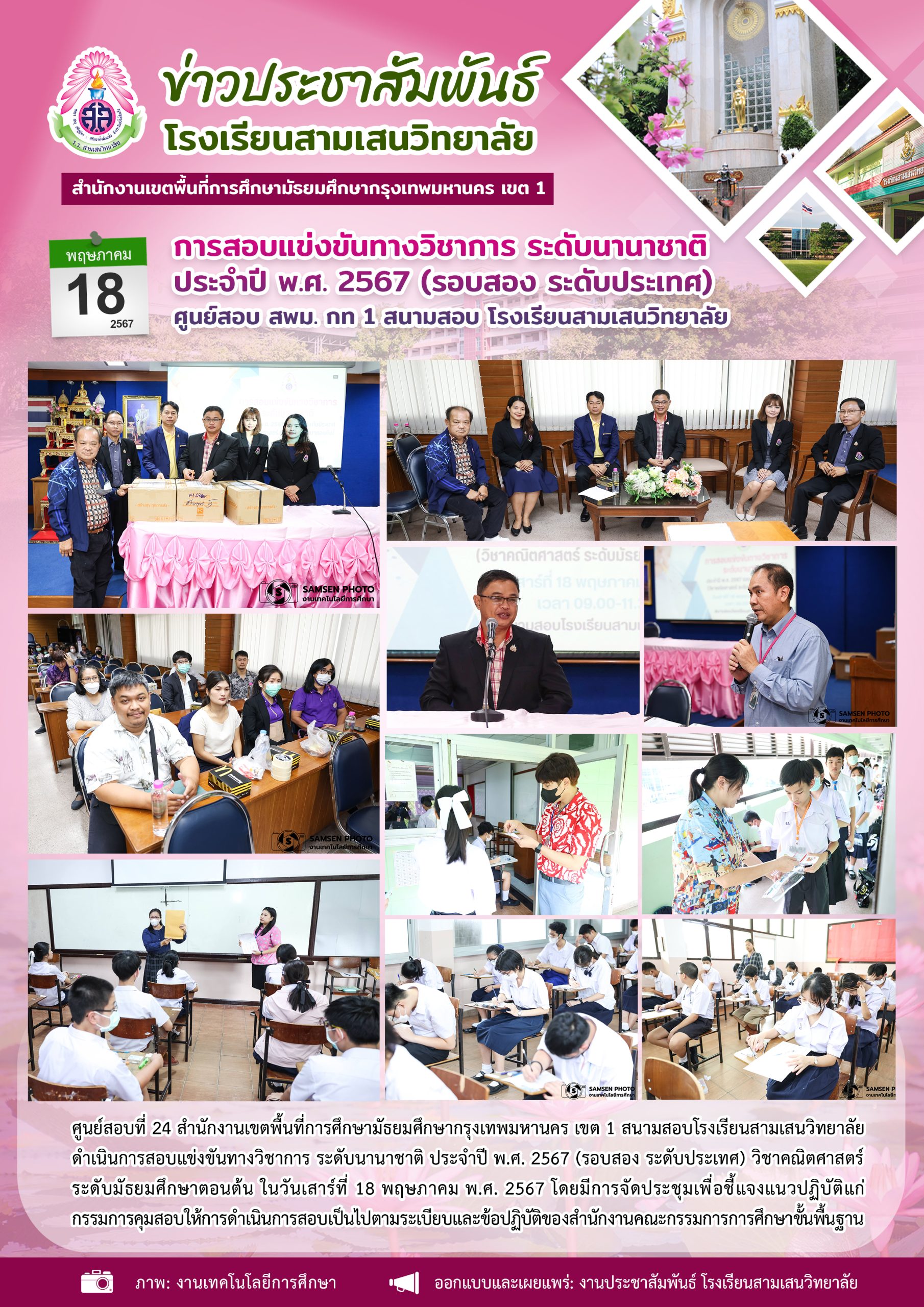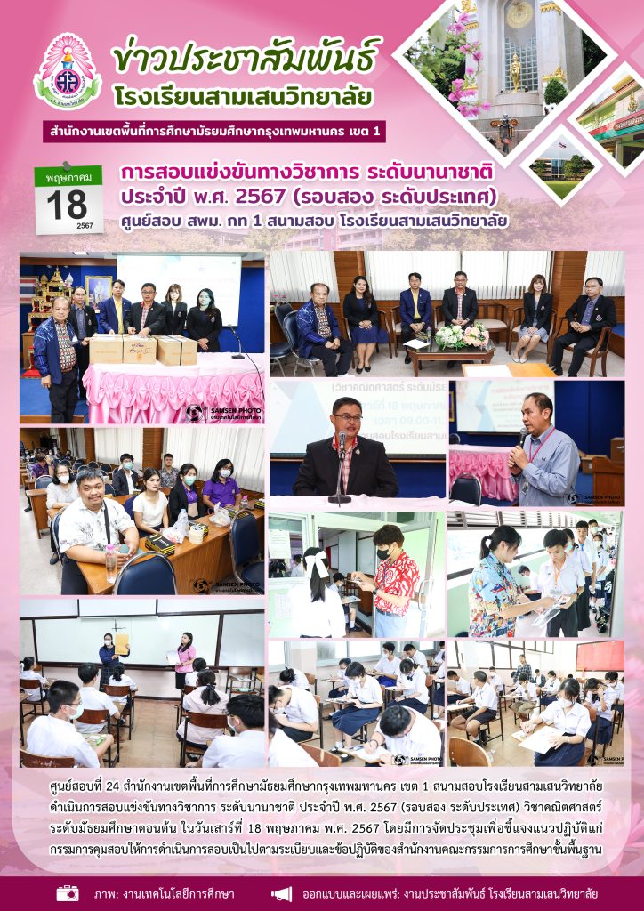 18 พฤษภาคม 2567 การสอบแข่งขันทางวิชาการ ระดับนานาชาติ ประจำปี พ.ศ. 2567 (รอบสอง ระดับประเทศ) ศูนย์สอบที่ 24 สพม. กท 1 สนามสอบ โรงเรียนสามเสนวิทยาลัย