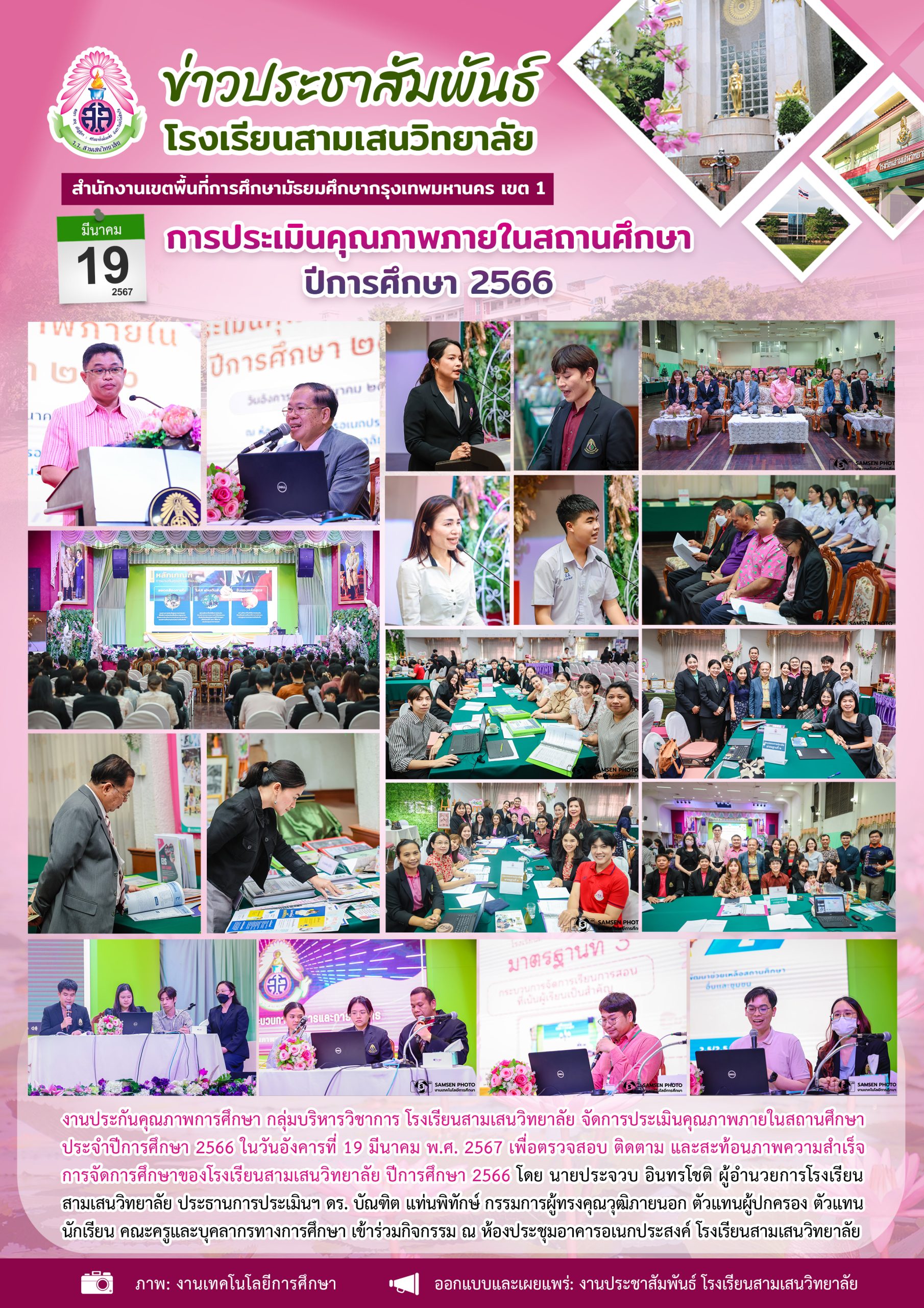 19 มีนาคม 2567 งานประกันคุณภาพการศึกษา กลุ่มบริหารวิชาการ โรงเรียนสามเสนวิทยาลัย จัดการประเมินคุณภาพภายในสถานศึกษา ปีการศึกษา 2566 เพื่อตรวจสอบ ติดตาม และสะท้อนภาพความสำเร็จการจัดการศึกษาของโรงเรียนสามเสนวิทยาลัย ปีการศึกษา 2566