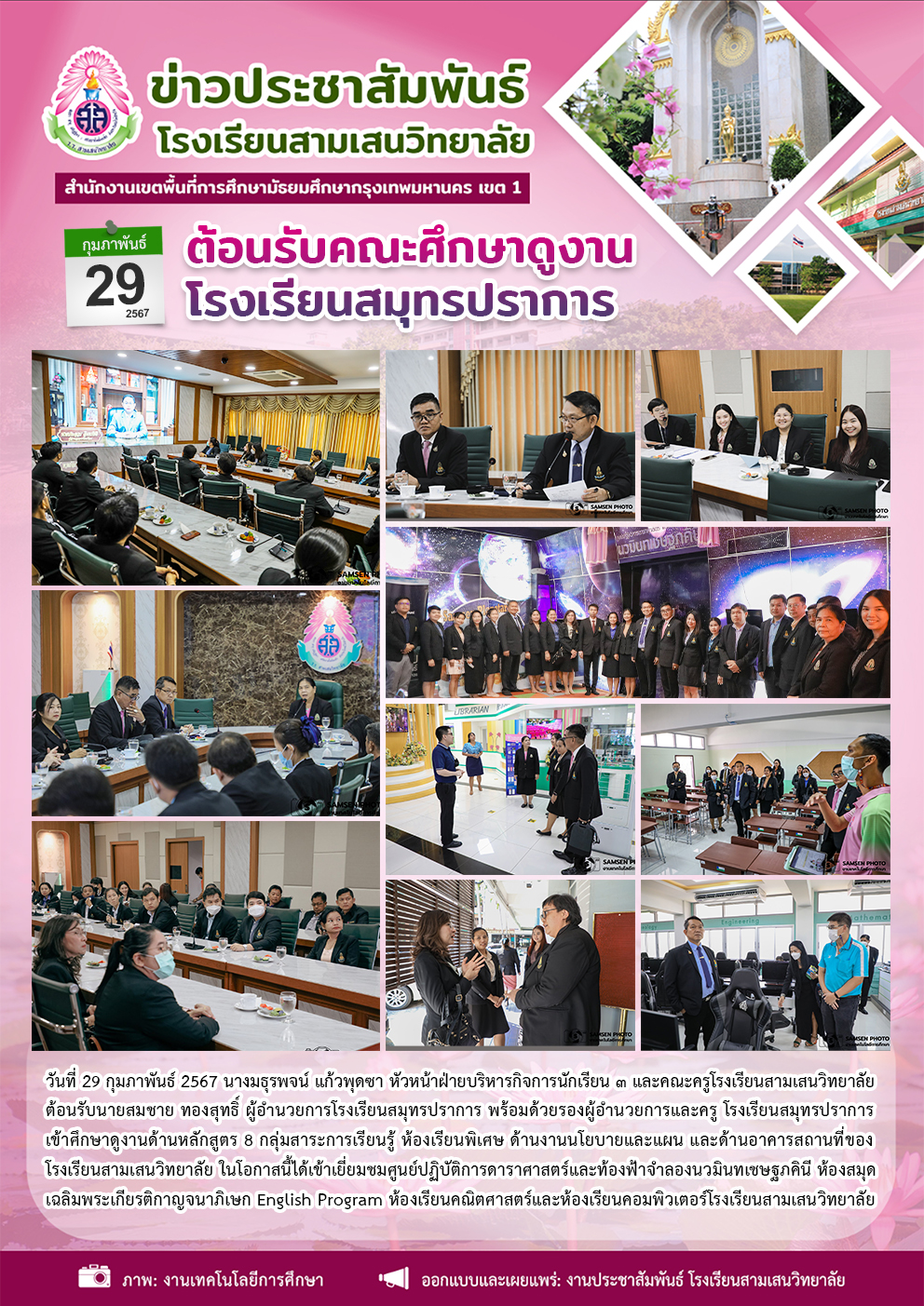 29 กุมภาพันธ์ 2567 ต้อนรับคณะศึกษาดูงาน โรงเรียนสมุทรปราการ เข้าศึกษาดูงานหลักสูตร 8 กลุ่มสาระการเรียนรู้ ห้องเรียนพิเศษ ด้านงานนโยบายและแผน และด้านอาคารสถานที่ของโรงเรียนสามเสนวิทยาลัย