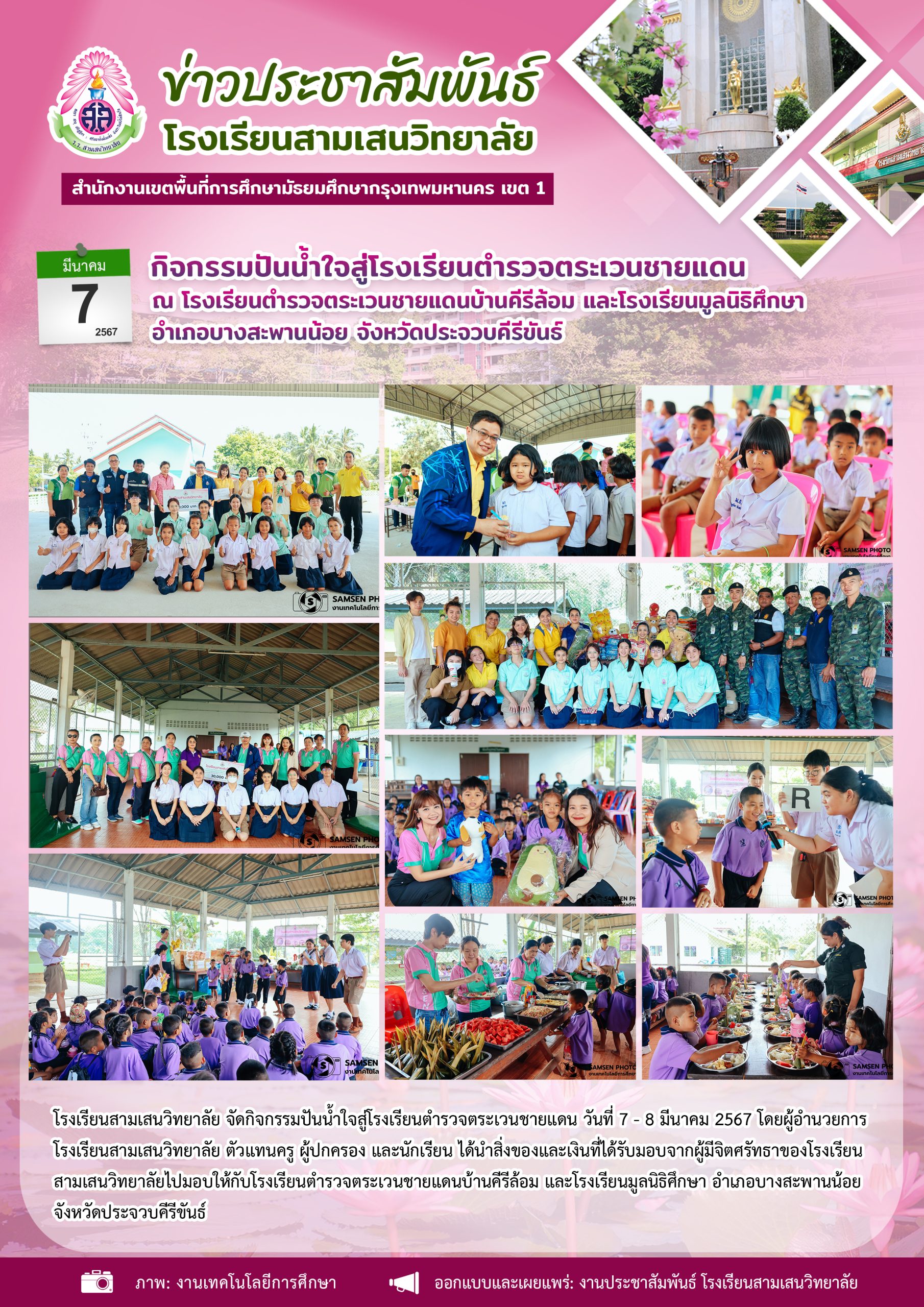 7-8 มีนาคม 2567 กิจกรรมปันน้ำใจสู่โรงเรียนตำรวจตระเวนชายแดน ณ โรงเรียนตำรวจตระเวนชายแดนบ้านคีรีล้อม และโรงเรียนมูลนิธิศึกษา อำเภอบางสะพานน้อย จังหวัดประจวบคีรีขันธ์