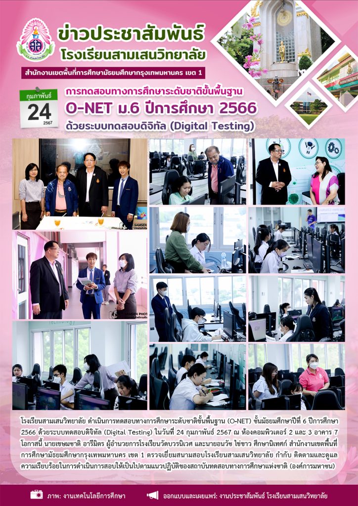 24 กุมภาพันธ์ 2567 โรงเรียนสามเสนวิทยาลัย ดำเนินการทดสอบทางการศึกษาระดับชาติขั้นพื้นฐาน (O-NET) ชั้นมัธยมศึกษาปีที่ 6 ปีการศึกษา 2566 ด้วยระบบทดสอบดิจิทัล (Digital Testing) ณ ห้องคอมพิวเตอร์ 2 และ 3 อาคาร 7