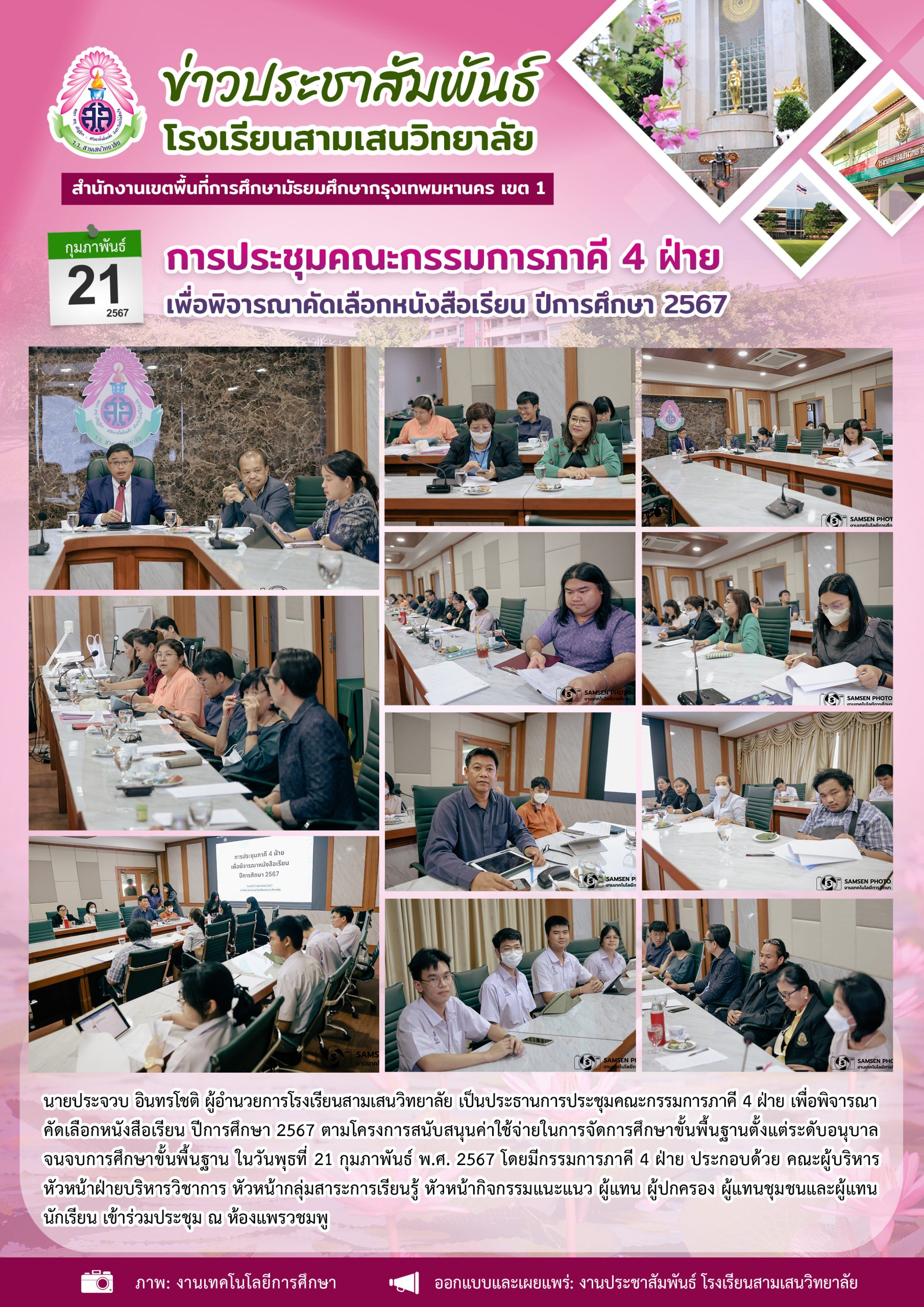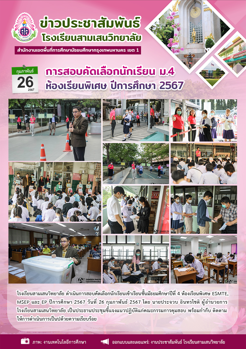 26 กุมภาพันธ์ 2567 การสอบคัดเลือกนักเรียนเข้าเรียนชั้นมัธยมศึกษาปีที่ 4 ห้องเรียนพิเศษ ปีการศึกษา 2567 โรงเรียนสามเสนวิทยาลัย