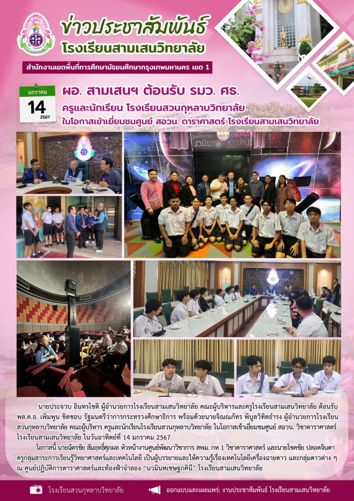14 มกราคม 2567 ผอ. สามเสนฯ ต้อนรับ รมว. ศธ. ครูและนักเรียน โรงเรียนสวนกุหลาบวิทยาลัย ในโอกาสเข้าเยี่ยมชมศูนย์ สอวน. ดาราศาสตร์ โรงเรียนสามเสนวิทยาลัย