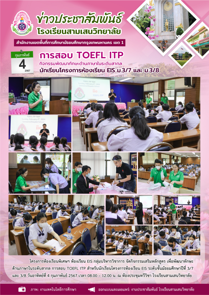 4 กุมภาพันธ์ 2567 การสอบ TOEFL ITP กิจกรรมพัฒนาทักษะด้านภาษาในระดับสากล นักเรียนโครงการห้องเรียน EIS ม.3/7 และ ม.3/8