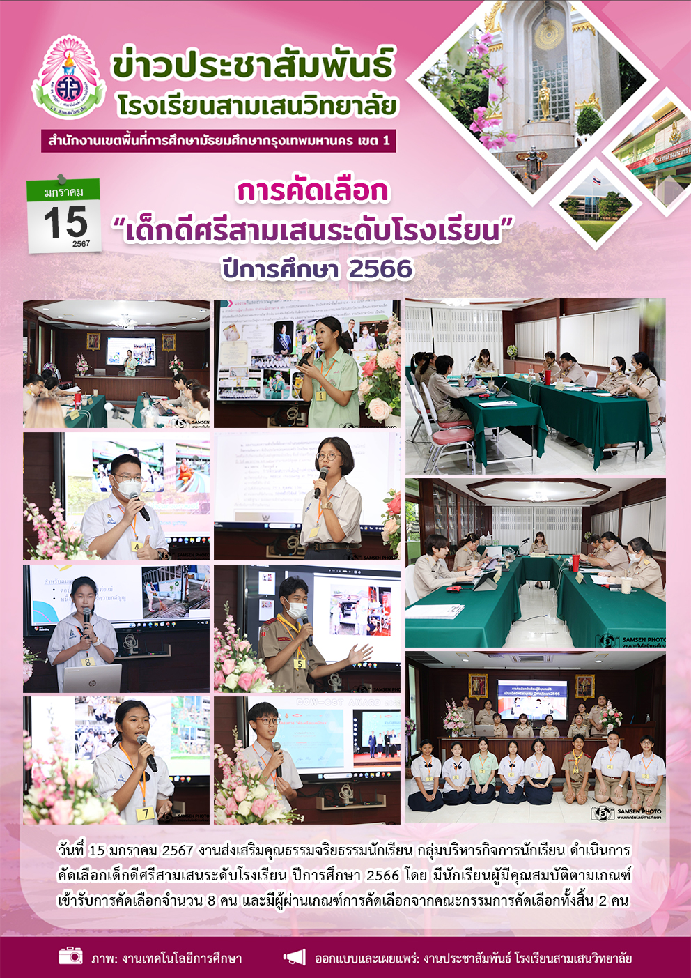 15 มกราคม 2567 การคัดเลือกเด็กดีศรีสามเสนระดับโรงเรียน ปีการศึกษา 2566 โดย งานส่งเสริมคุณธรรมจริยธรรมนักเรียน กลุ่มบริหารกิจการนักเรียน