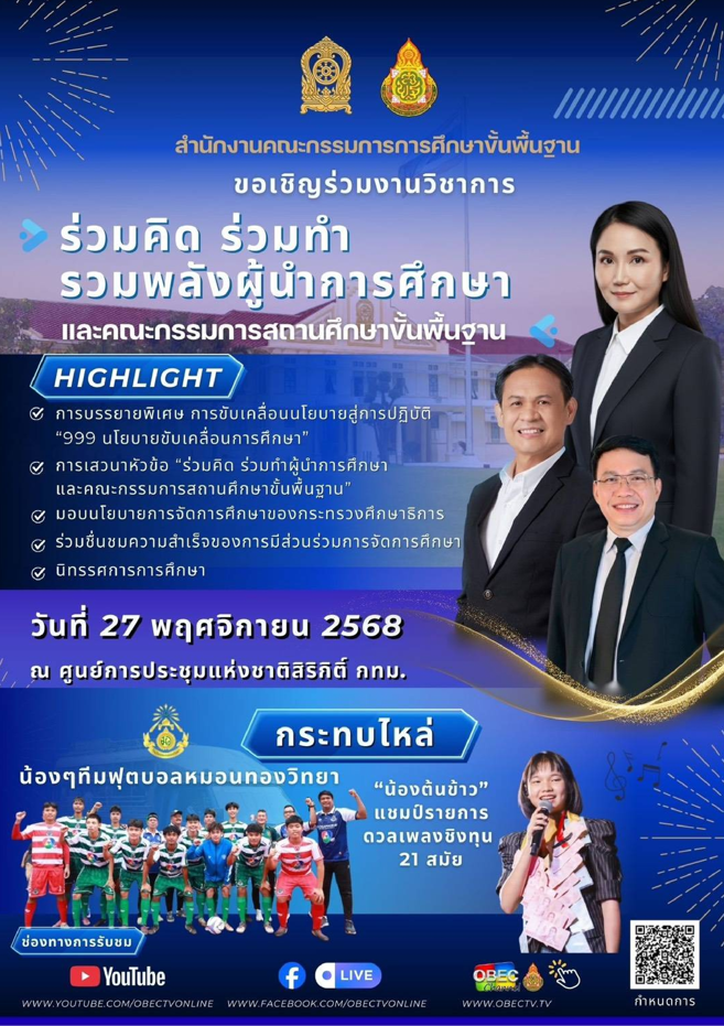 โรงเรียนสามเสนวิทยาลัย ขอเชิญครู ผู้ปกครองและนักเรียน ร่วมชมนิทรรศการ ในงานประชุมสัมมนาวิชาการ “ร่วมคิด ร่วมทำ รวมพลังผู้นำการศึกษา และคณะกรรมการสถานศึกษาขั้นพื้นฐาน” สังกัดสำนักงานคณะกรรมการการศึกษาขั้นพื้นฐาน 🗓️ ในวันพฤหัสบดีที่ 27 พฤศจิกายน 2568 ณ ศูนย์ประชุมแห่งชาติสิริกิติ์ กรุงเทพมหานคร