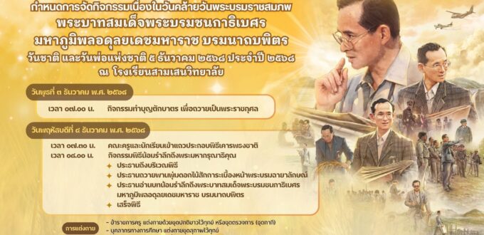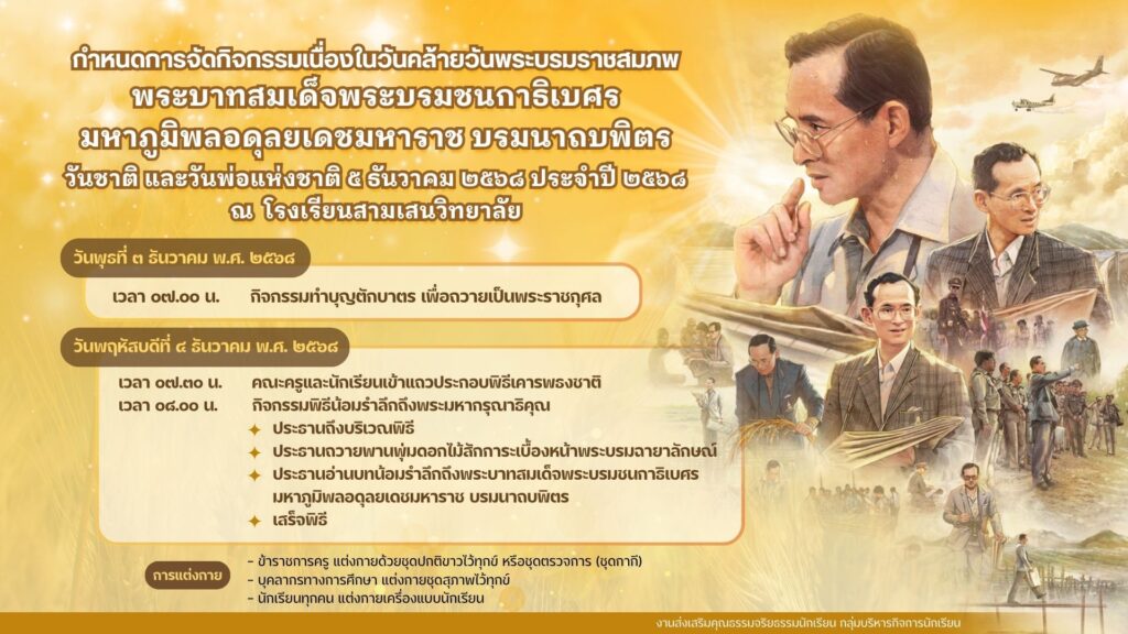 กำหนดการจัดกิจกรรมเนื่องในวันคล้ายวันพระบรมราชสมภพ พระบาทสมเด็จพระบรมชนกาธิเบศร มหาภูมิพลอดุลยเดชมหาราช บรมนาถบพิตร วันชาติ และวันพ่อแห่งชาติ 5 ธันวาคม 2568 ประจำปี 2568 ในวันที่ 3 และ 4 ธันวาคม 2568 ณ โรงเรียนสามเสนวิทยาลัย