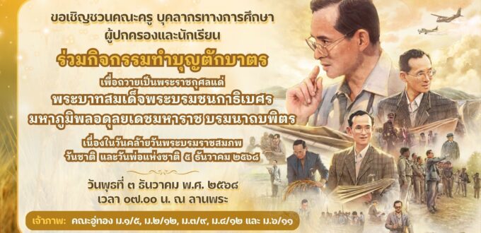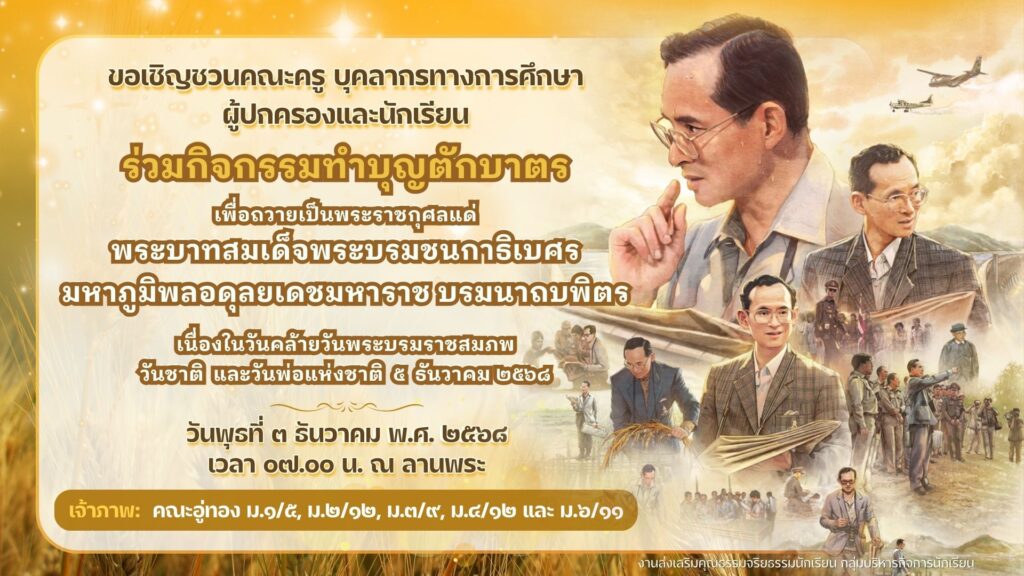 ขอเชิญชวนคณะครู บุคลากรทางการศึกษา ผู้ปกครองและนักเรียน ร่วมกิจกรรมทำบุญตักบาตรเพื่อถวายเป็นพระราชกุศลแด่ พระบาทสมเด็จพระบรมชนกาธิเบศร มหาภูมิพลอดุลยเดชมหาราช บรมนาถบพิตร เนื่องในวันคล้ายวันพระบรมราชสมภพ วันชาติและวันพ่อแห่งชาติ 5 ธันวาคม 2568 ในวันพุธที่ 3 ธันวาคม พ.ศ. 2568 เวลา 07.00 น. ณ ลานพระ