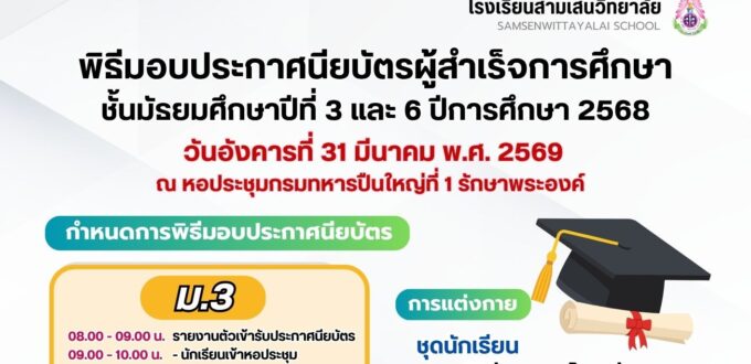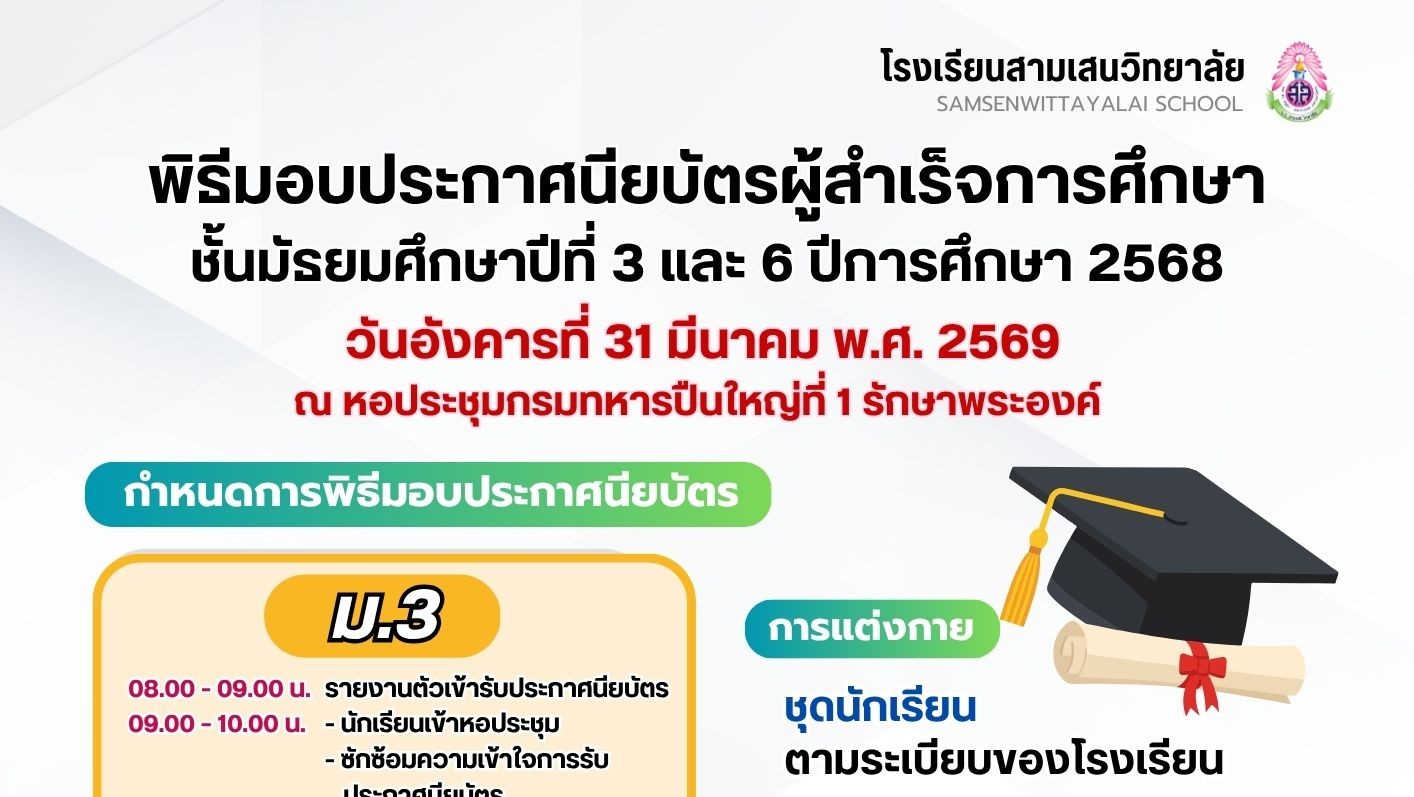 🚩 พิธีมอบประกาศนียบัตรผู้สำเร็จการศึกษา ชั้นมัธยมศึกษาปีที่ 3 และ 6 ปีการศึกษา 2568