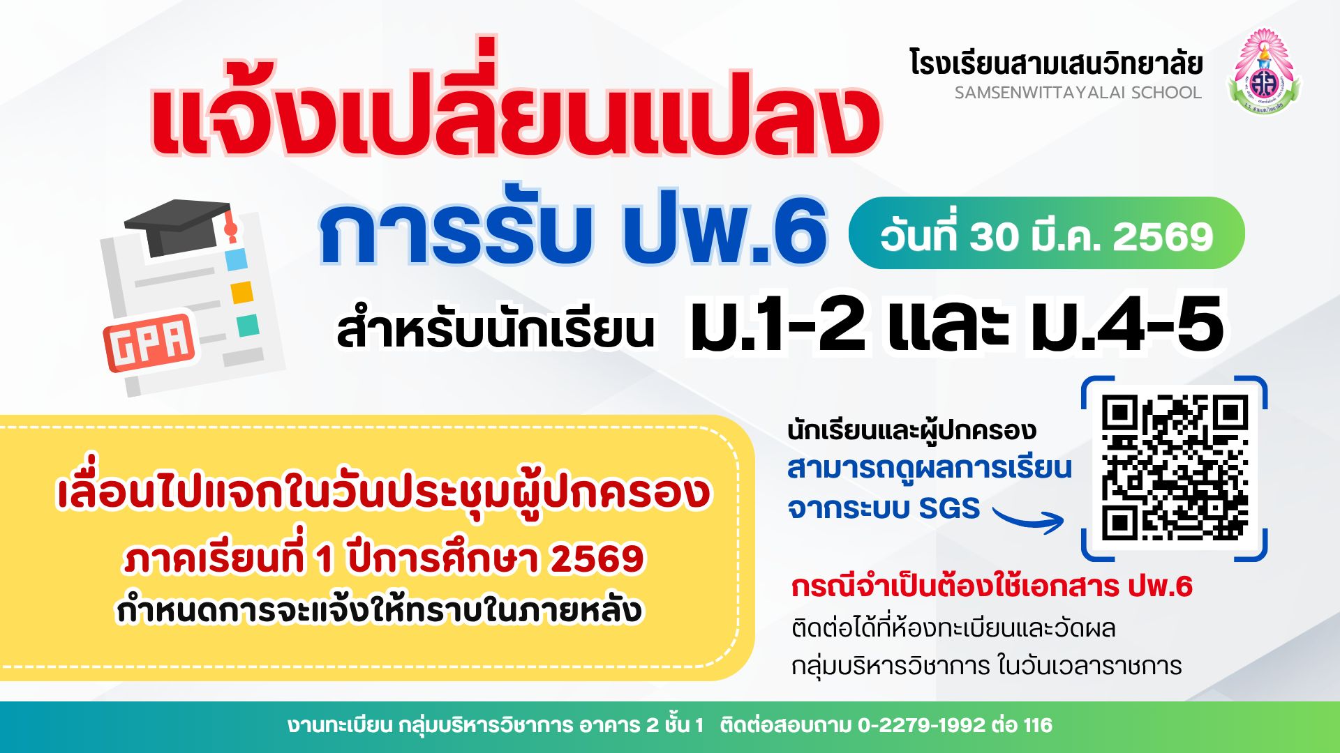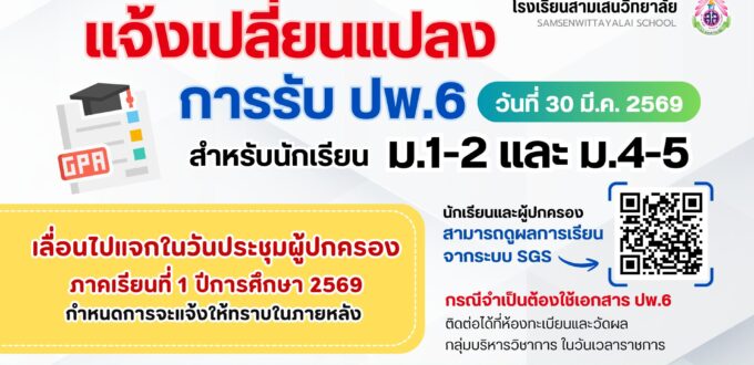 🚩 แจ้งเปลี่ยนแปลงการรับ ปพ.6 สำหรับนักเรียน ม.1-2 และ ม.4-5 ปีการศึกษา 2568