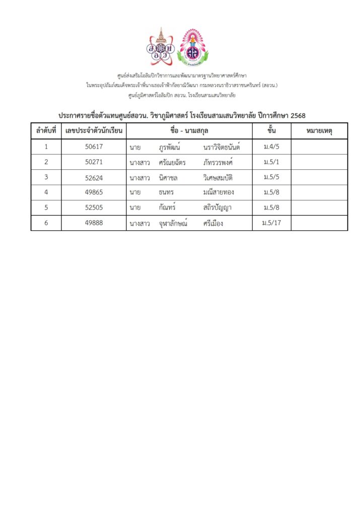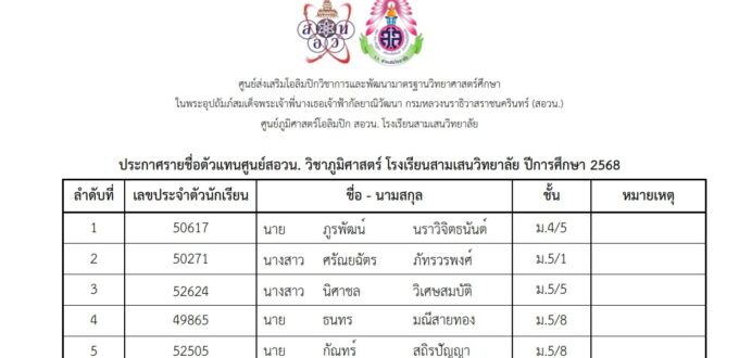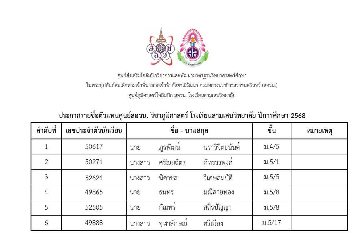 ศูนย์ภูมิศาสตร์โอลิมปิก สอวน. โรงเรียนสามเสนวิทยาลัย ประกาศรายชื่อตัวแทนศูนย์ สอวน. วิชาภูมิศาสตร์ โรงเรียนสามเสนวิทยาลัย ปีการศึกษา 2568