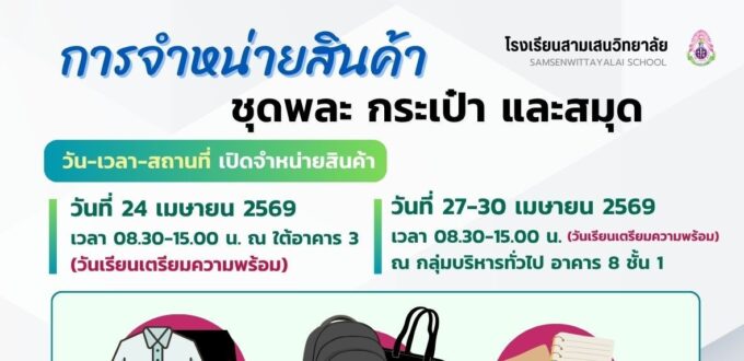 โรงเรียนสามเสนวิทยาลัย เปิดจำหน่ายสินค้า ชุดนักเรียน ชุดพละ สมุด และกระเป๋า ในวันที่ 24, 27-30 เมษายน 2569 (ช่วงเรียนเตรียมความพร้อมลูกสามเสนฯ) ดาวน์โหลด >> แบบปักเสื้อ