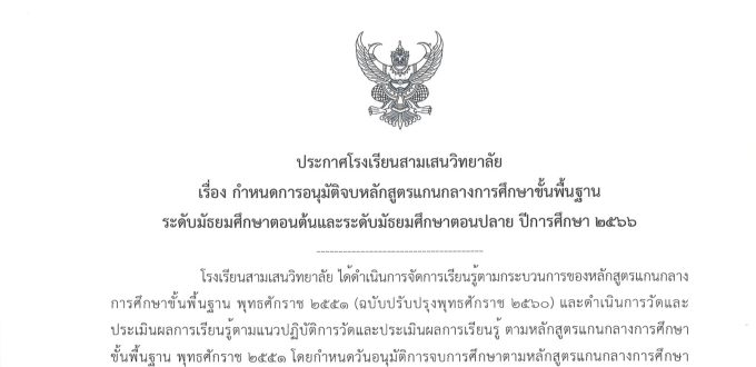 ประกาศโรงเรียนสามเสนวิทยาลัย เรื่อง กำหนดการอนุมัติจบหลักสูตรแกนกลางการศึกษาขั้นพื้นฐาน ระดับมัธยมศึกษาตอนต้นและระดับมัธยมศึกษาตอนปลาย ปีการศึกษา 2566