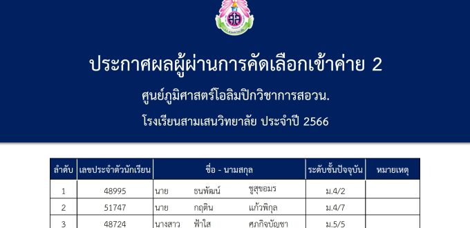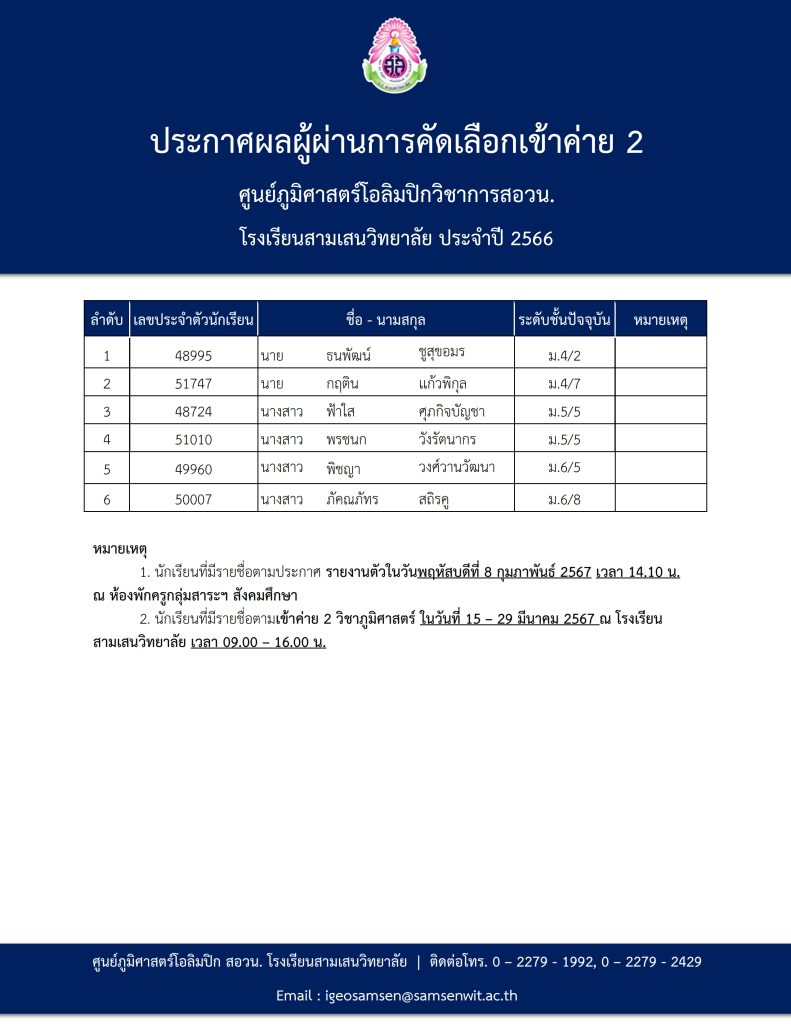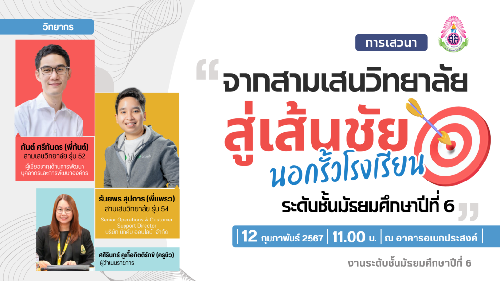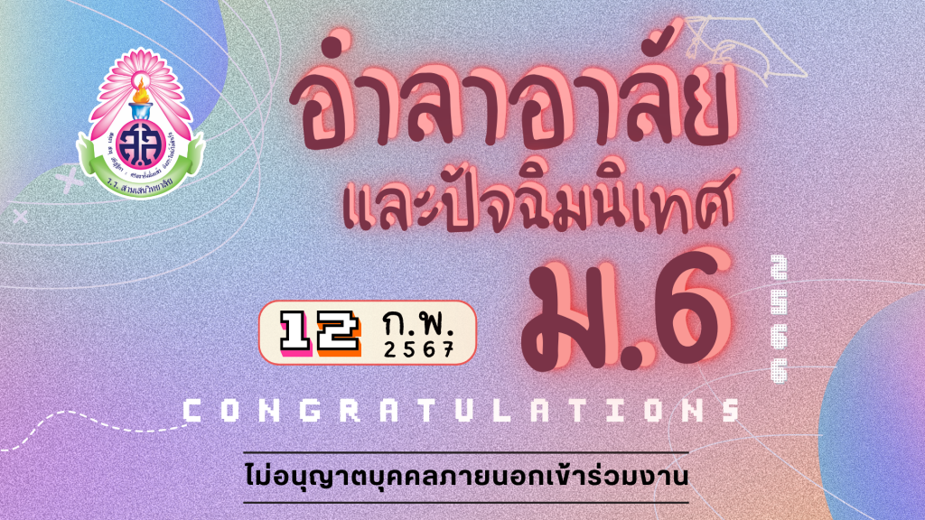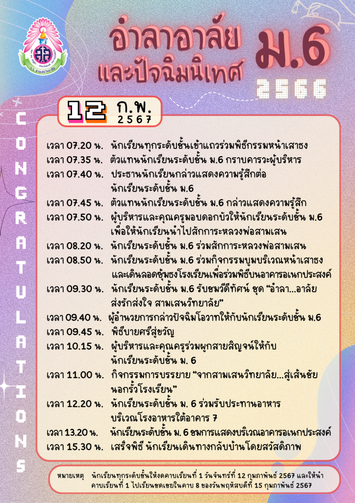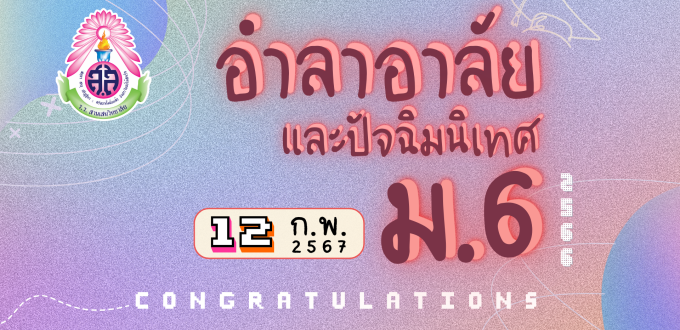 นักเรียนทุกระดับชั้นให้งดคาบเรียนที่ 1 วันจันทร์ที่ 12 กุมภาพันธ์ 2567 และให้นำคาบเรียนที่ 1 ไปเรียนชดเชยในคาบ 8 ของวันพฤหัสบดีที่ 15 กุมภาพันธ์ 2567