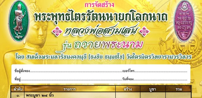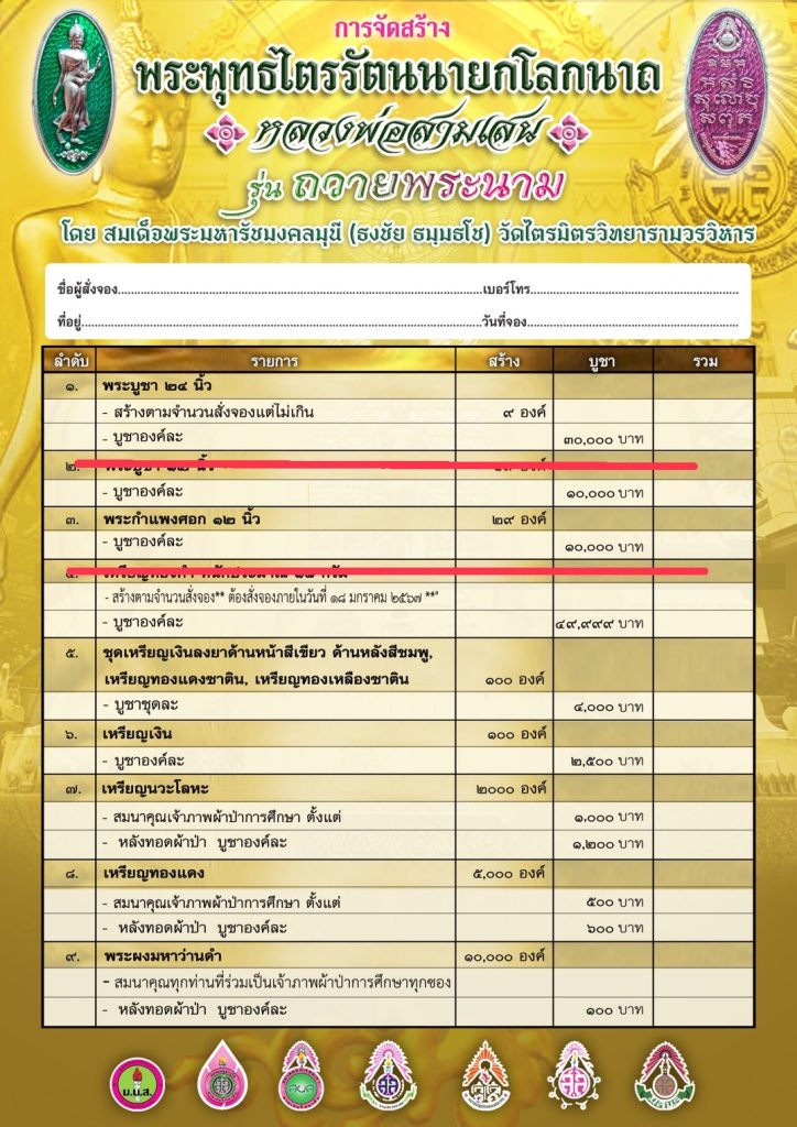หมายเหตุ การสั่งจองที่ถือว่าสมบูรณ์ ต่อเมื่อผู้ทำการสั่งจองได้กรอกข้อมูลครบถ้วนพร้อมชำระเงินแล้วเท่านั้น เนื่องจากการสร้างพระครั้งนี้มีจำนวนจำกัด ขออภัยในความไม่สะดวก
