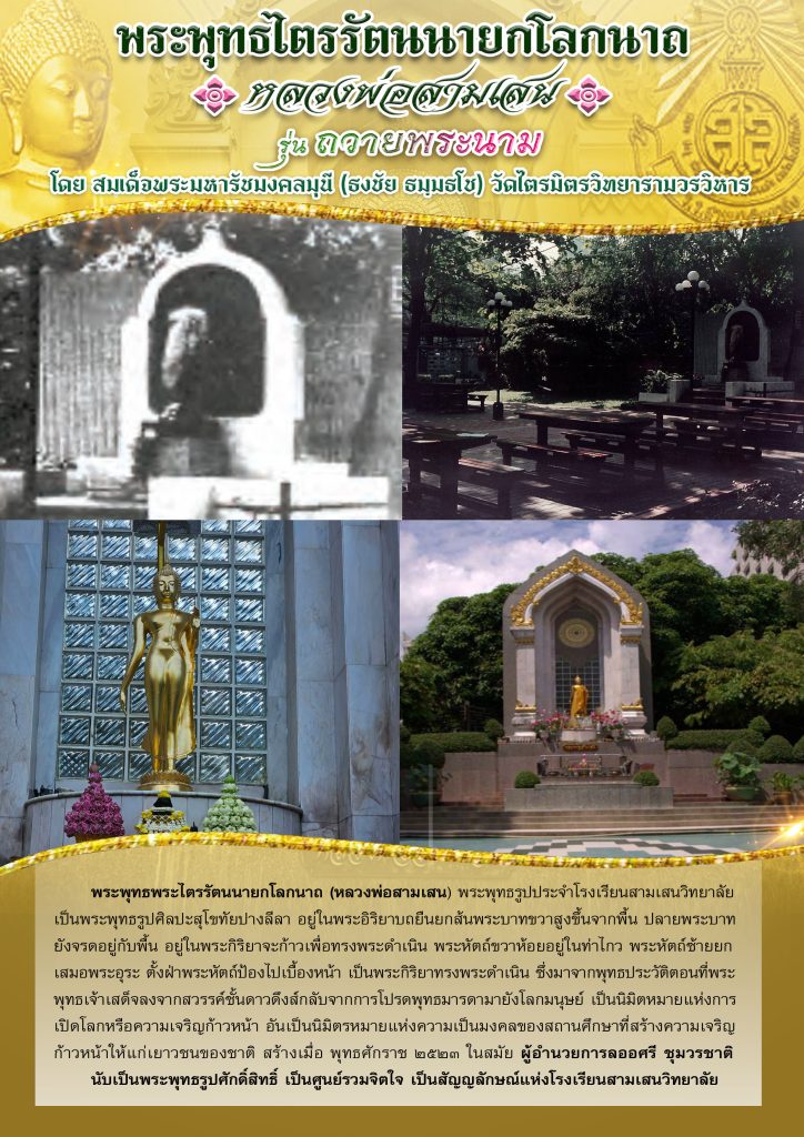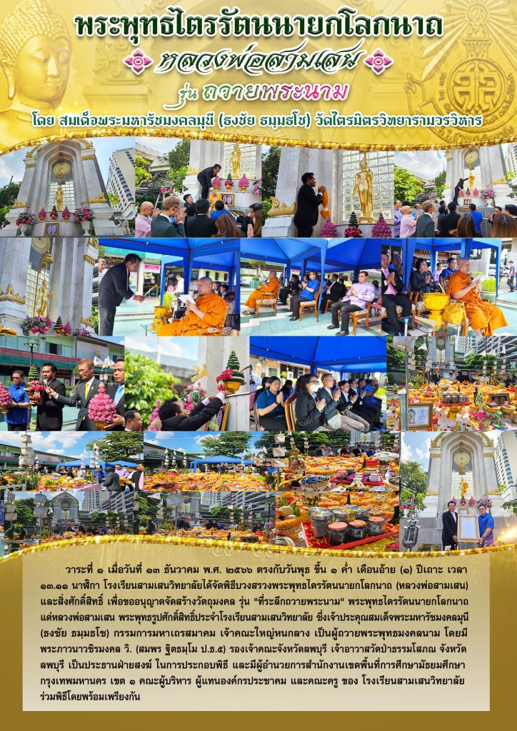 ขอเชิญชวนประชาคมสามเสนและบุคคลทั่วไป ร่วมกันประชาสัมพันธ์งานทอดผ้าป่าเพื่อการศึกษาโรงเรียนสามเสนวิทยาลัย และพิธีสมโภชน์ พระพุทธไตรรัตนนายกโลกนาถ (หลวงพ่อสามเสน) ในวันอาทิตย์ที่ 28 มกราคม 2567 ทั้งนี้ท่านสามารถสั่งจองเช่าบูชา พระพุทธไตรรัตนนายกโลกนาถ (หลวงพ่อสามเสน) ที่ผ่านพิธีพุทธาภิเษกอย่างสมบูรณ์ครบทุกองค์จากท่านสมเด็จพระมหารัชมงคลมุนี (ท่านเจ้าคุณธงชัย) วัดไตรมิตรวิทยารามฯ เรียบร้อยแล้ว (ตามรายละเอียดที่สรุปข้างล่างที่แนบมานี้)