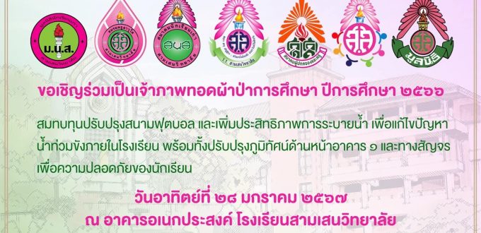ขอเชิญร่วมเป็นเจ้าภาพทอดผ้าป่าเพื่อการศึกษา สมทบทุนปรับปรุงสนามฟุตบอล และเพิ่มประสิทธิภาพการระบายน้ำ เพื่อแก้ไขปัญหาน้ำท่วมขัง พร้อมทั้งปรับปรุงภูมิทัศน์ด้านหน้าอาคาร 1 และทางสัญจร เพื่อความปลอดภัยของนักเรียน